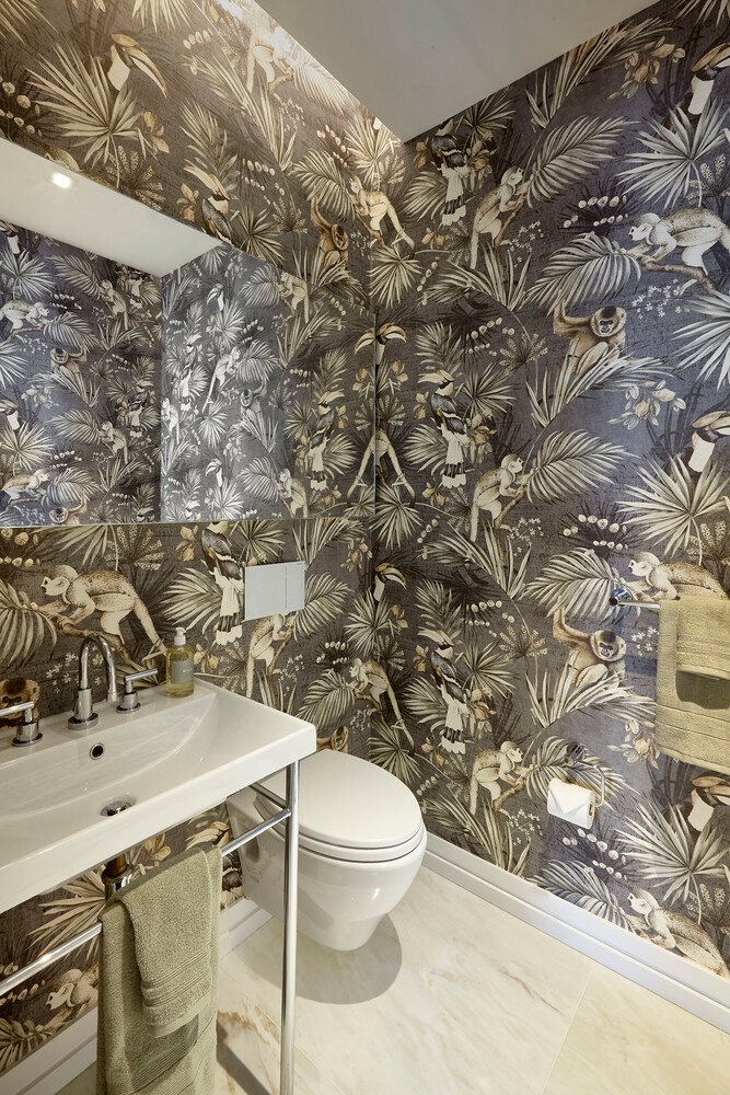 A washer and dryer are tucked away in the tranquil powder room with custom-designed pedestal sink, Cremo Delicato honed marble slab floor to complete this elegant residence.
