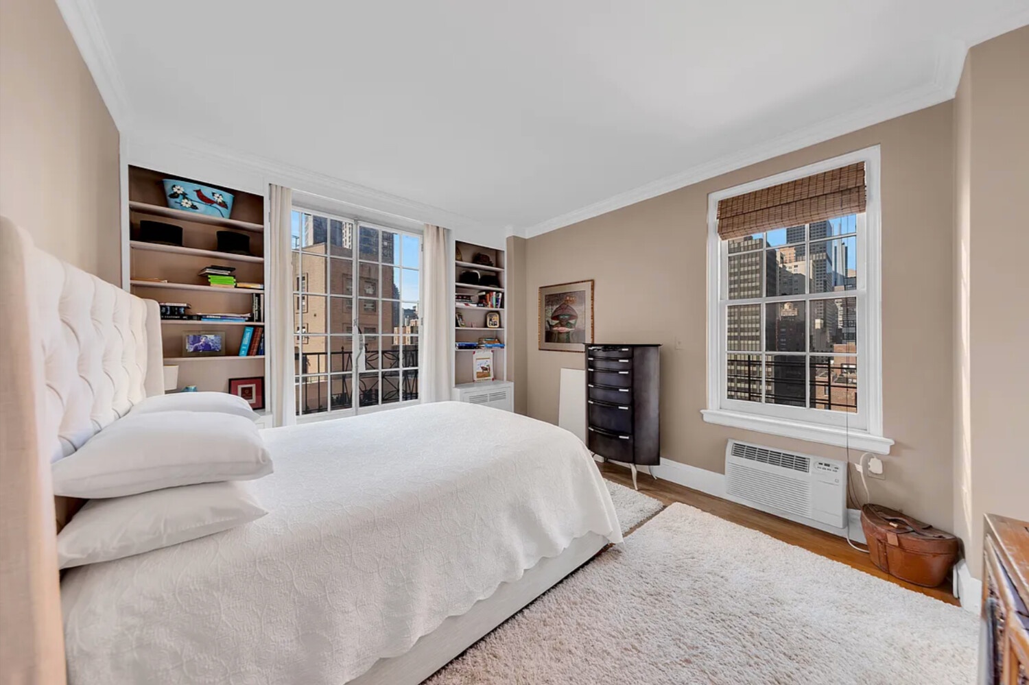 Buildings designed by the renowned architect Rosario Candela are favored for their elegant and livable floorplans, and Apartment 13F at the beautiful 14 Sutton Place South embodies this trait. A home to love, you can move right into this classic 2 bedroom, 2 bath home that combines pre-war charm with modern amenities. On a high floor with beautiful light and open city views from the dramatic oversized picture windows, including French doors to a balcony perfect for Juliet to beckon for her beloved Romeo. The inviting living room enjoys gleaming original oak herringbone floors, high beamed ceilings and a dramatic wood burning fireplace. The windowed kitchen is bright and perfectly laid-out, with custom cabinetry, stone countertops, appliances and backsplashes, and would satisfy any gourmet chef. The primary bedroom suite is a peaceful retreat, featuring ample closet space and an en suite windowed bathroom. The second full bedroom is flooded with light through the French doors leading to the Juliet balcony and has terrific NYC views, including One Vanderbilt. You will enjoy a welcoming entry and great closets.