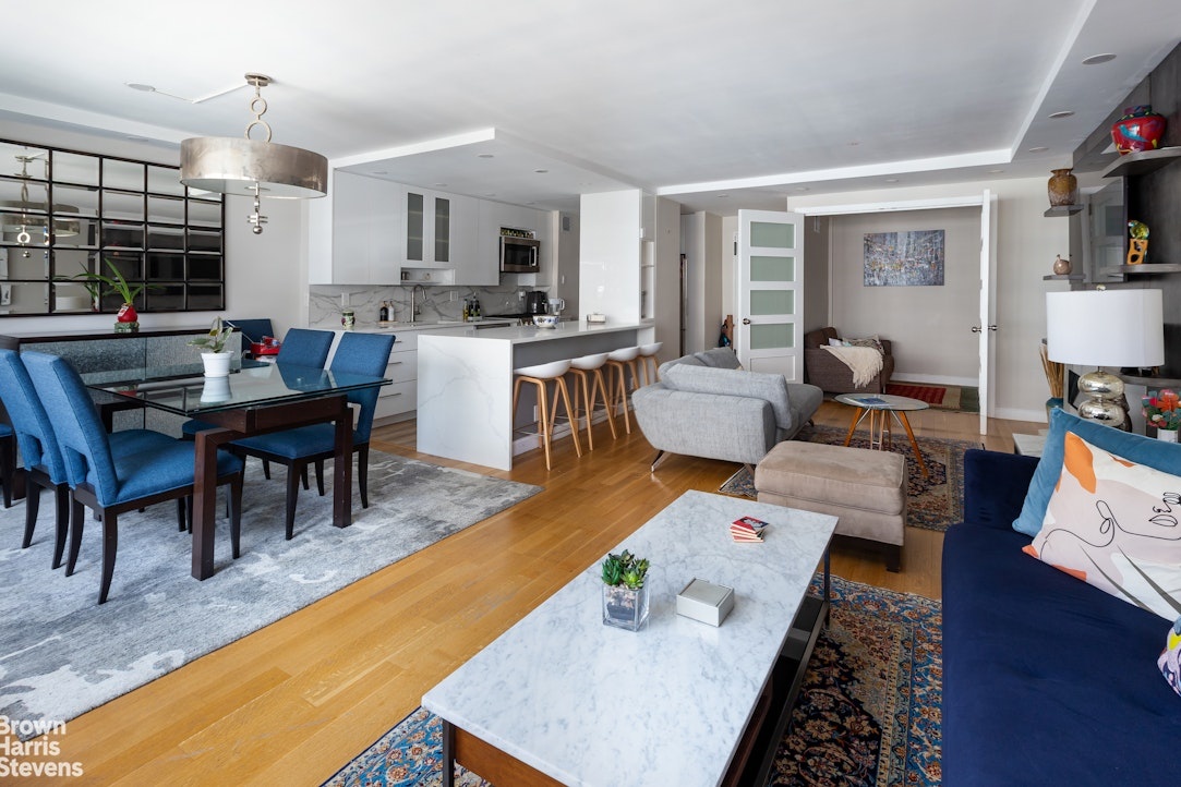 The open chef's kitchen is a true showpiece, featuring an island, top-of-the-line appliances, wine storage, abundant cabinetry, and generous counter space-all bathed in natural light. A fireplace and newly finished wide-plank wood floors add warmth and sophistication throughout.