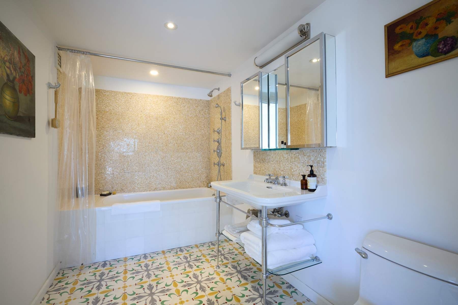 The second bedroom, which also faces east, can be re-opened to the living/dining room to create an expansive entertainment area if desired. The open kitchen is a chef’s dream, outfitted with reclaimed wood cabinets, Liebherr refrigerator, Viking Range, Broan Vent, Bosch dishwasher, and a charming breakfast bar area with a Miele washer/dryer.
