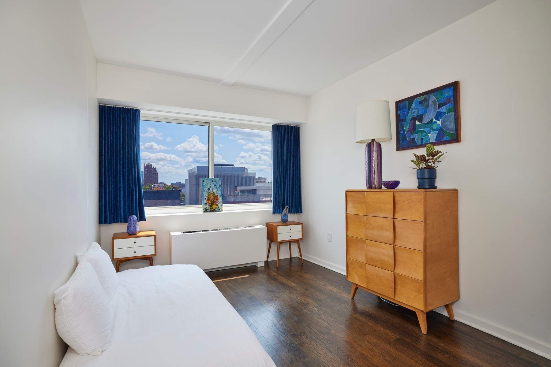 The oversized 21’2" x 20’8" living/dining area faces north towards the iconic Chrysler and Empire State Buildings, and east towards the Williamsburg Bridge. Enjoy your morning coffee on the adjacent balcony while basking in the sun. Built-in cabinets line the northern windows, providing ample storage and display space.
