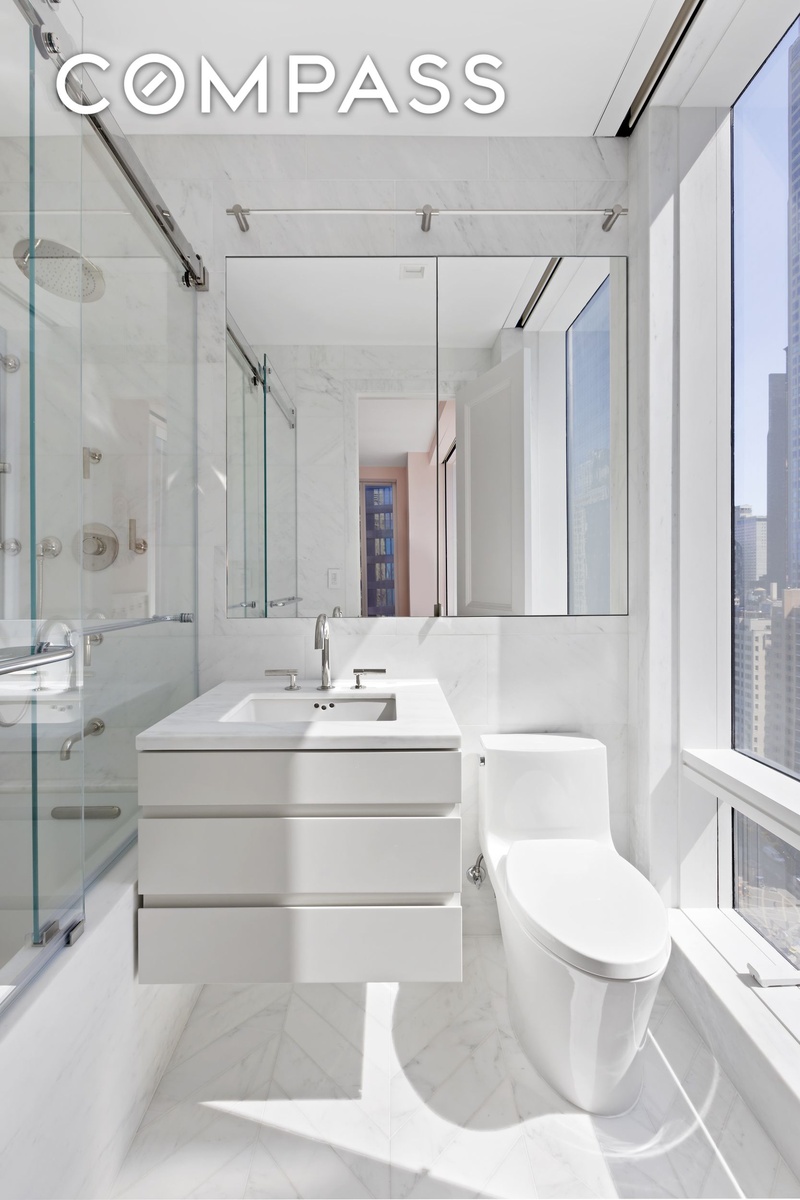 Relax and unwind in the expansive, magazine-worthy living room surrounded by coffered ceilings, wide-plank oak floors and custom white oak built-ins, or plan your next dinner party in the inviting dining room topped by an illuminated cove ceiling and dazzling chandelier. Outside, the dazzling Midtown skyline and Central Park treetops create an unmatched backdrop for lavish entertaining and indulgent daily life. In the work-of-art kitchen, custom gray cabinetry, stone counters and brass hardware flank upscale appliances, including a Bosch dishwasher, Miele built-in coffee system, and a five-burner gas range, wine refrigerator and microwave by Viking. A breakfast counter provides the perfect perch for morning coffee overlooking Columbus Circle.