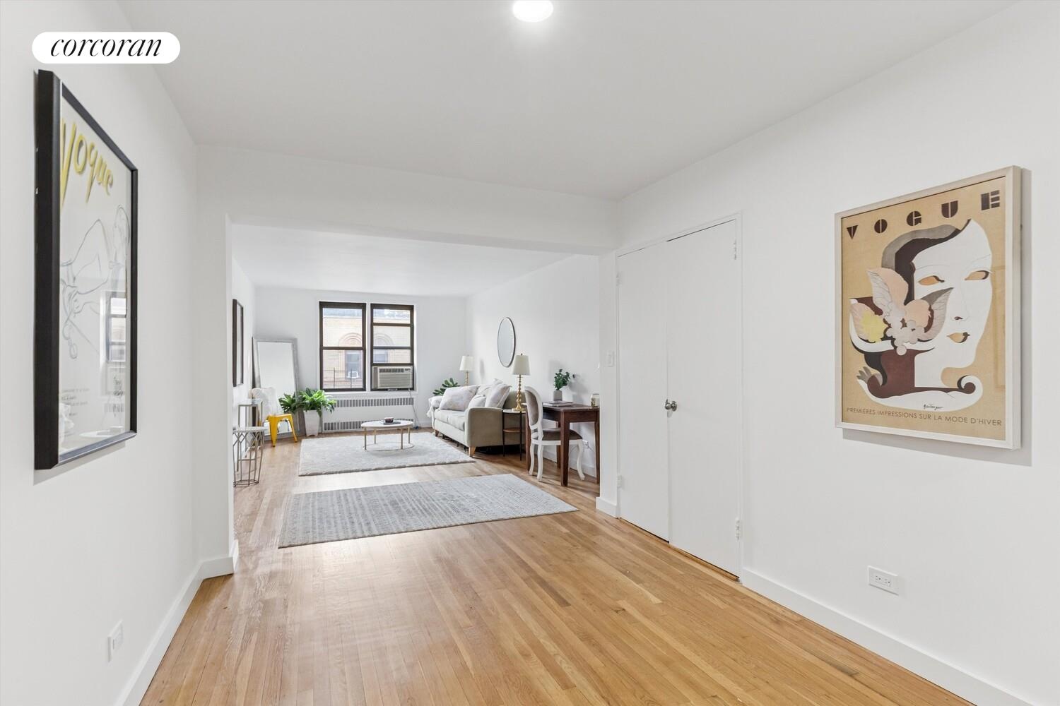 Welcome to apartment #7G! Upon entering, you are greeted by large north-facing windows that fill the home with natural light, setting the stage for a bright and welcoming environment. Original wood floors run throughout, adding a touch of timeless warmth and elegance, and offering the perfect foundation for a future renovation.