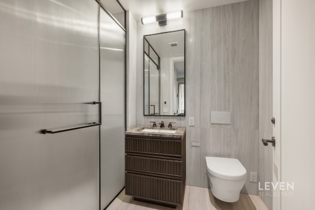 Experience elevated living in this exquisite one-bedroom, one-and-a-half-bath residence at Lantern House, ideally located directly on the High Line with serene northern views over tree-lined 19th Street. A gracious entry foyer opens into a spacious great room, where refined details and high-end finishes define the space. The chefs kitchen features custom bronze-finished hardware, Gaggenau appliances including wine refrigeration and a dishwasher, and elegant Calacatta Venato marble countertops and backsplash. Five-inch wide plank French oak floors run throughout, complemented by high 9'9" ceilings. The primary suite includes a luxurious en-suite bath clad in Nestos Beige marble, with radiant heated floors, opal white marble countertops, and bespoke fixtures, including a wall-mounted Toto toilet and fluted mirror panels. A dramatic powder room with a polished Black Onyx feature wall completes this sophisticated home, which also includes an in-unit washer/dryer for added convenience.