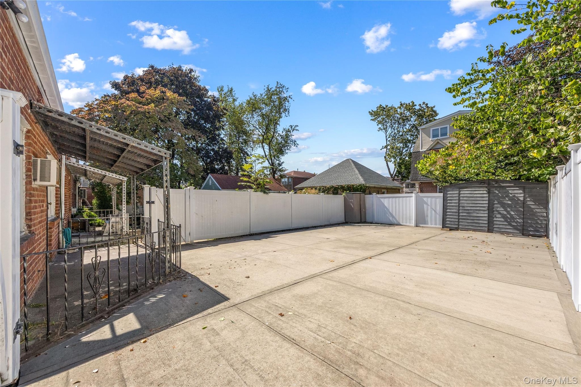 - Fenced backyard with a patio area and a gate
