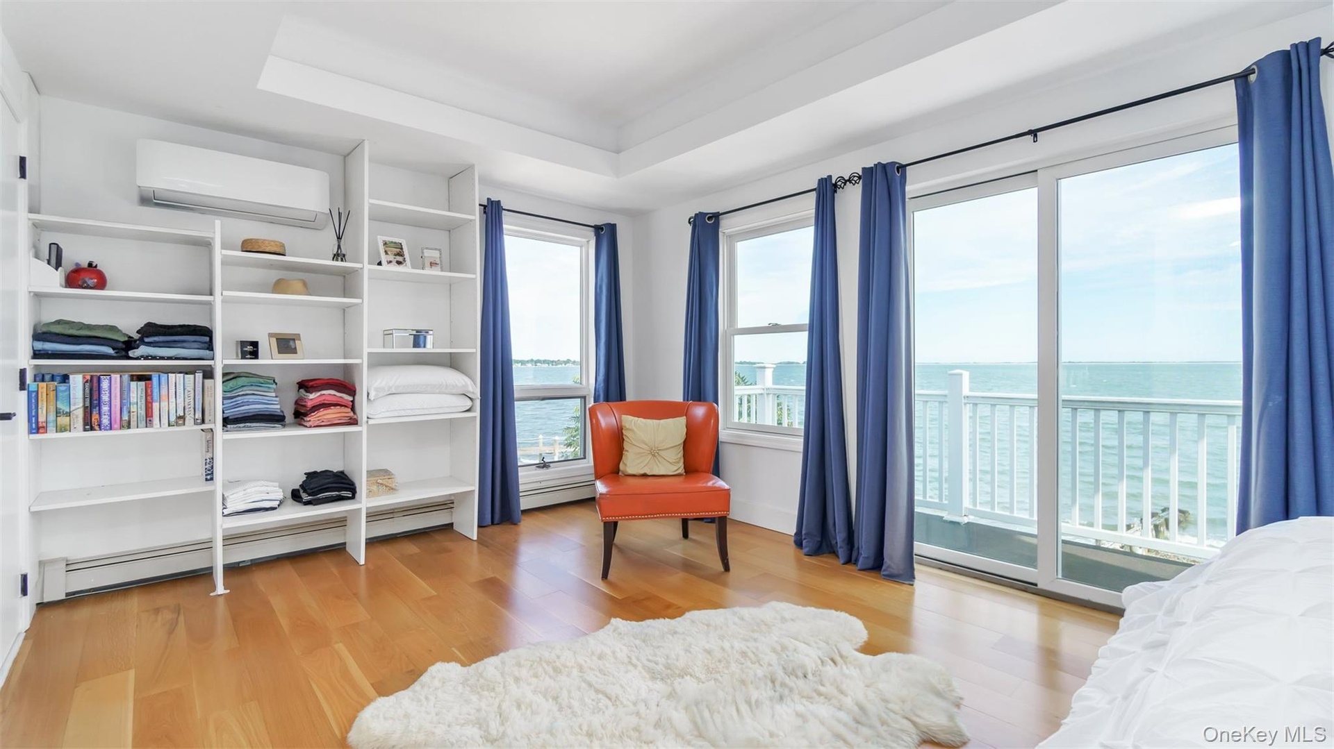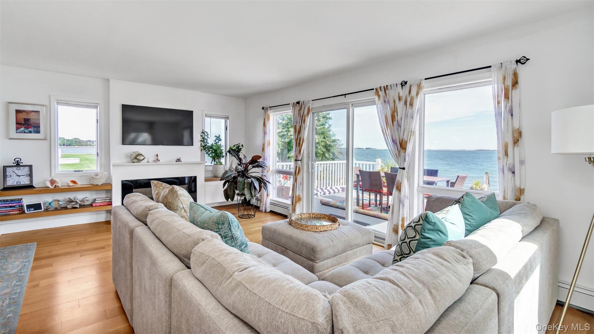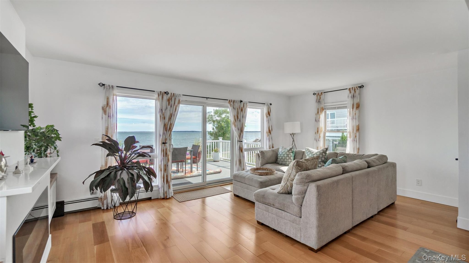 - Living room with healthy amount of natural light, light wood-style floors, a water view, and baseboard heating