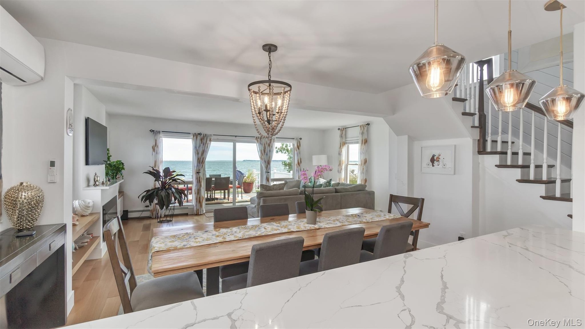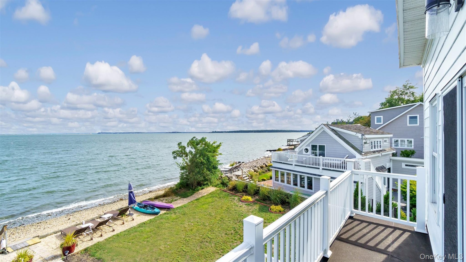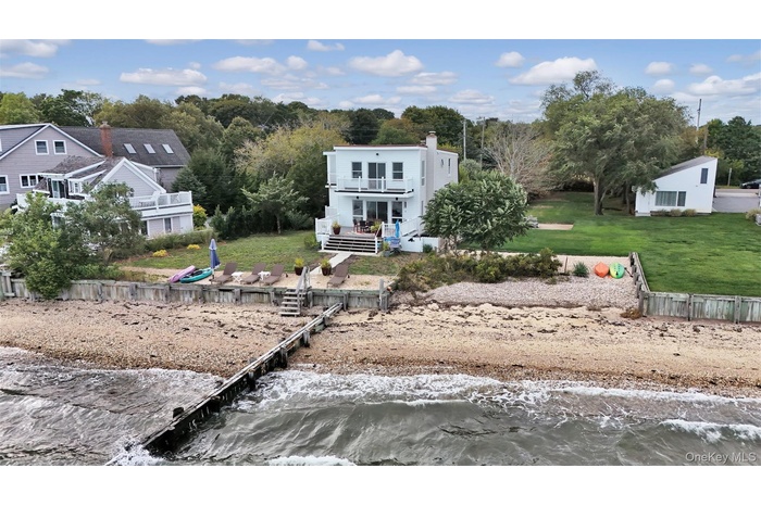 Welcome Home to 12960 Main Road, a Rare Bayfront, Beachfront Beauty! This (3) Bedroom, (3) Bath Residence is fully-updated, light and bright, and features a desirable open floor plan, with windows and sliders throughout, offering panoramic views of Gardiner's Bay and Bug Light. As you enter the foyer leading to the stunning Chef's Kitchen and Living Room, you will be captivated by the wall of windows and glass sliders showcasing the vast Blue Bay and Blue Sky, and you will be hooked! The Living Room also has an attractive electric fireplace, adding ambiance and warmth on those cooler days of the year. As they say in Real-Estate, "Location, Location, Location!" and this is one that can't be beat, as you and your family and friends will feel so relaxed and rejuvenated in this serene coastal environment, that you won't want to leave! There is a first floor Den with glass sliders, a balcony, and a waterview which may serve as a possible 4th Bedroom. There is also a Full Bath, Laundry area, Storage and Utility Room on the First Floor. Upstairs, you will find the Primary Suite, complete with sliders and a balcony, ideal for enjoying sunrises and sunsets, while viewing the plentiful boaters, kayakers and paddleboarders on the open water! One of the other two Guest Bedrooms upstairs features glass sliders with a balcony, as well as an adjacent "Bonus" Room, which may serve as a wonderful children's playroom or office. The 3rd Full Bath is also located on the Second Floor. This Residence is made for entertaining, sporting a large trex deck off the Living Room and overlooking the Bay, where so many meals and festivities may be enjoyed, as well as offering private Beachfront, a mooring and bulkheading. Room for an inground, waterfront pool enhances the appeal of this property, as does its private gated entrance and finished shed with electric, which may serve as a future pool house. And, for additional activities and options, the Village of Greenport is only a short distance away, offering a vast array of Art Galleries, Museums, Fishing Charters, Golf, Boutique Shops, Breweries and Cideries, Waterfront Dining and other Entertainment Venues. Simply stated, here you may enjoy a lifestyle second-to-none, and one which you so richly deserve!