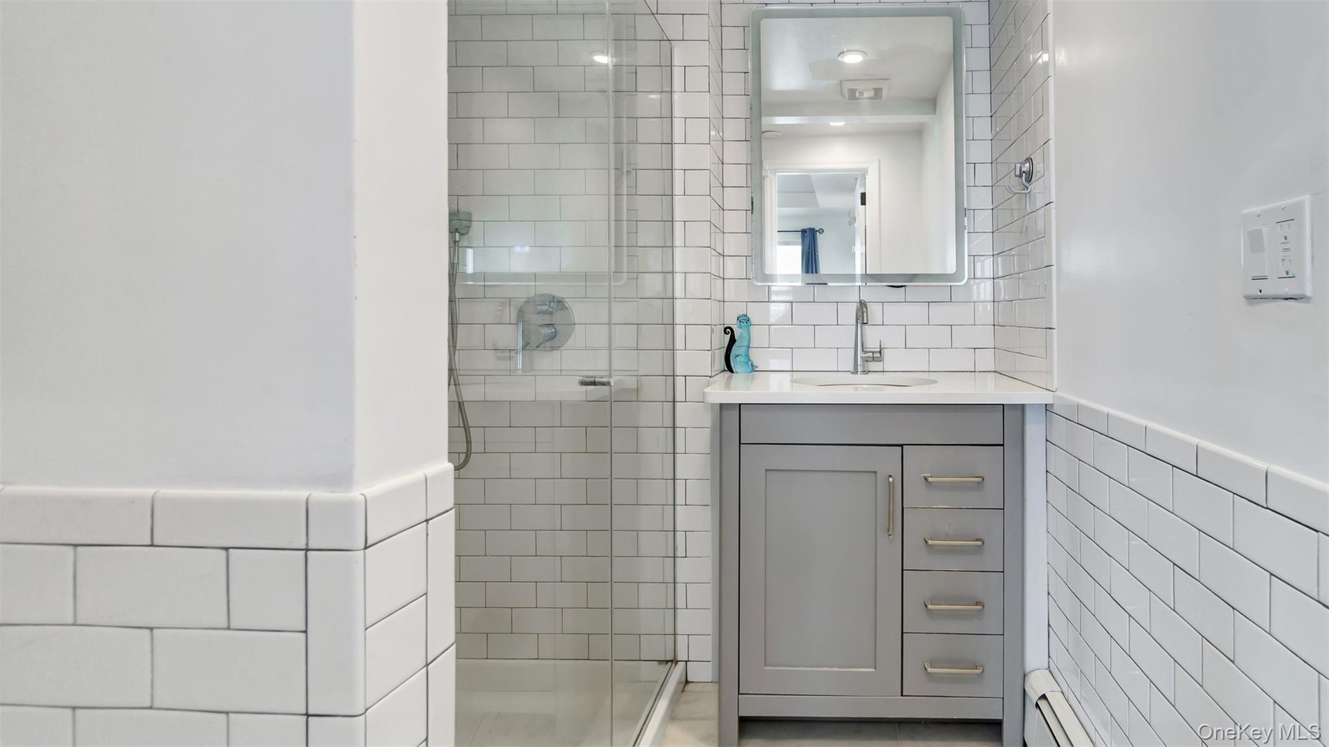 - Primary Bathroom with tile walls, vanity, a stall shower, wainscoting, and a baseboard heating unit