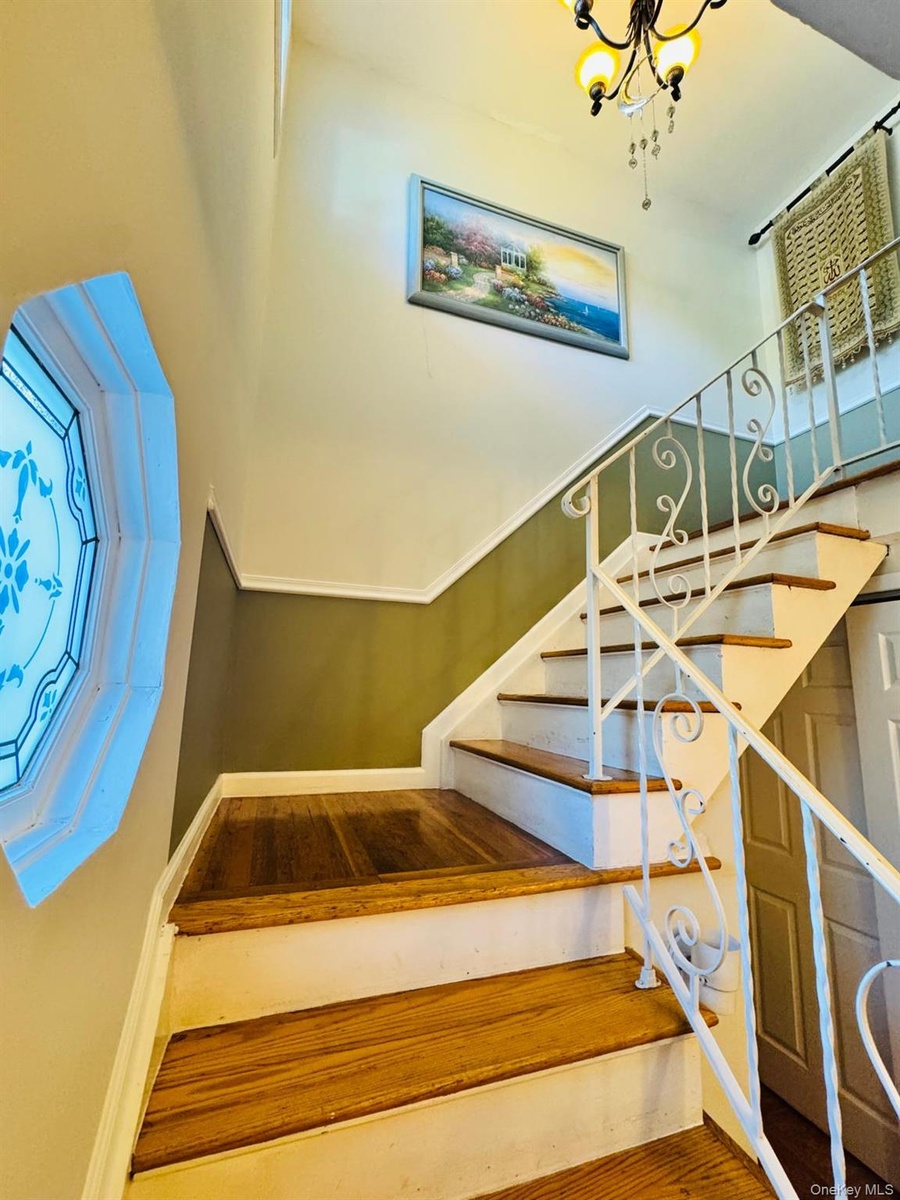 - Staircase featuring wood finished floors, plenty of natural light, and a chandelier