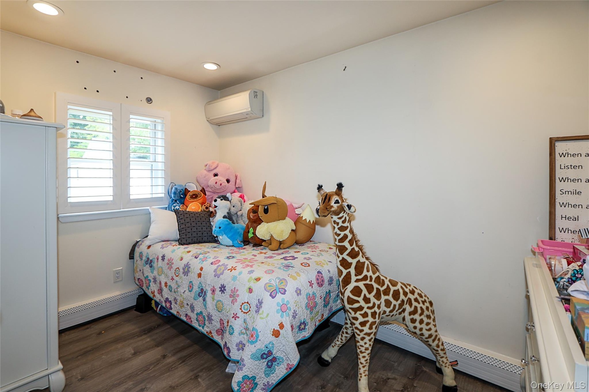 - Bedroom featuring baseboard heating, dark wood-type flooring, recessed lighting, and an AC wall unit