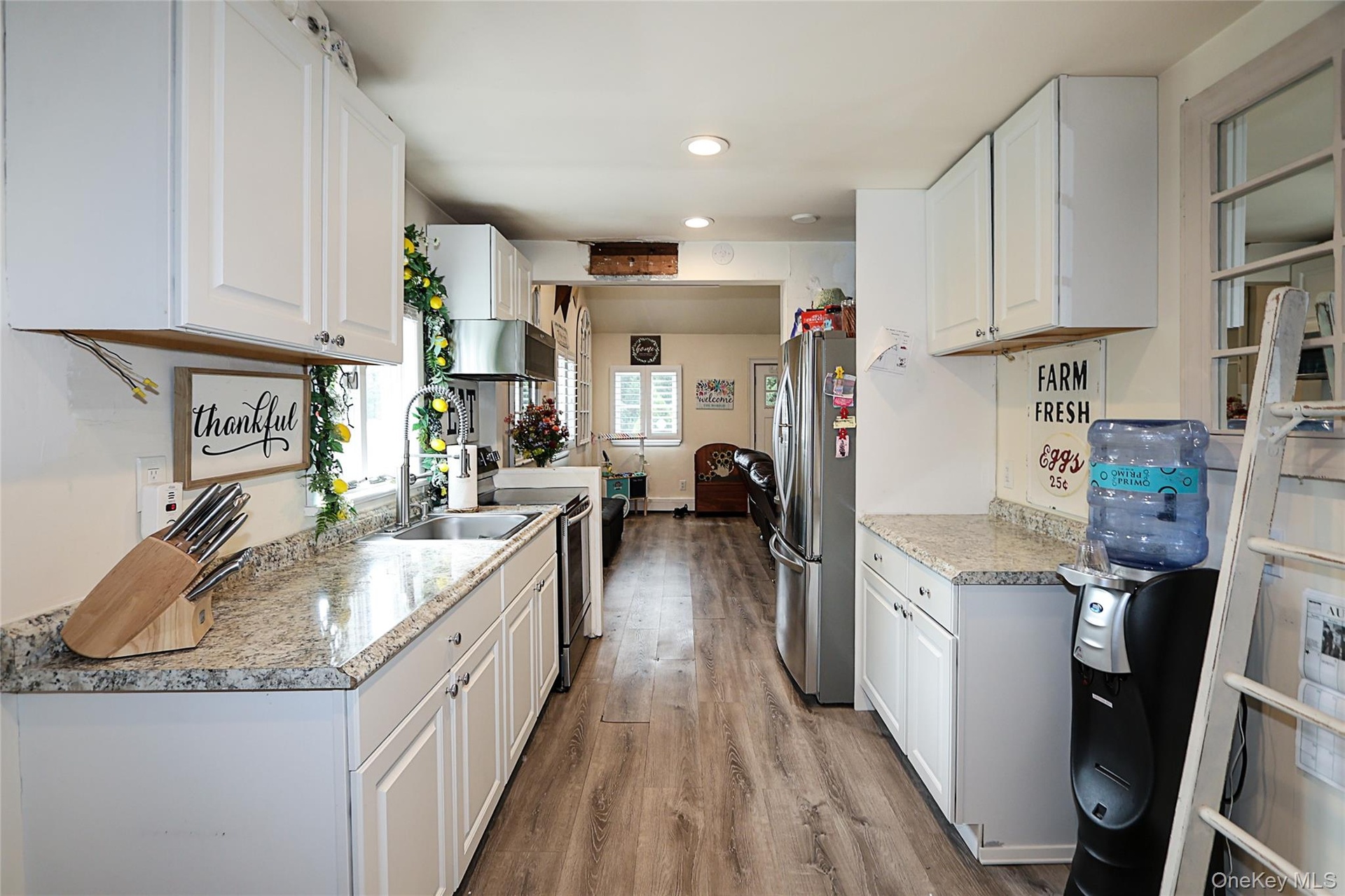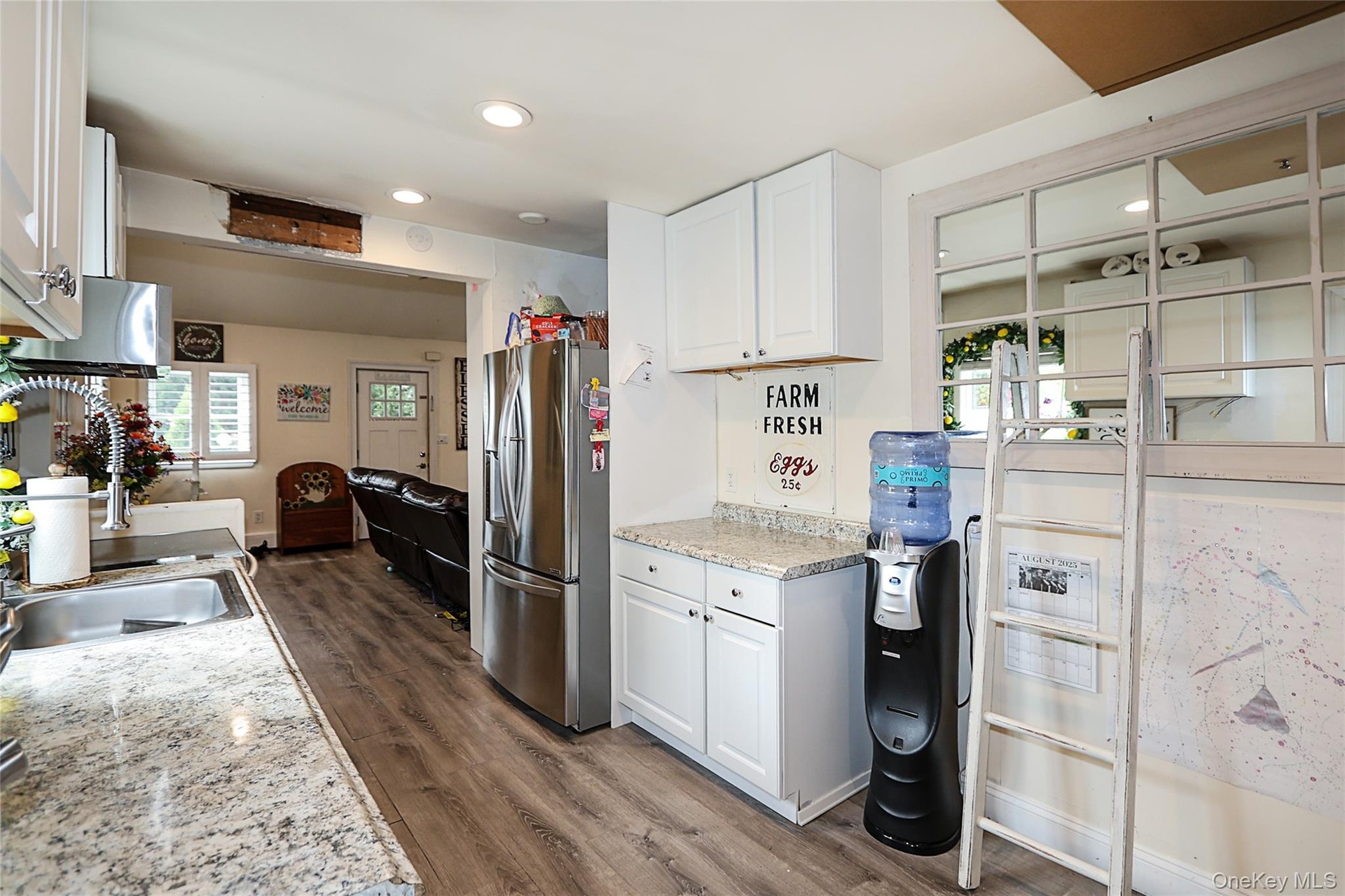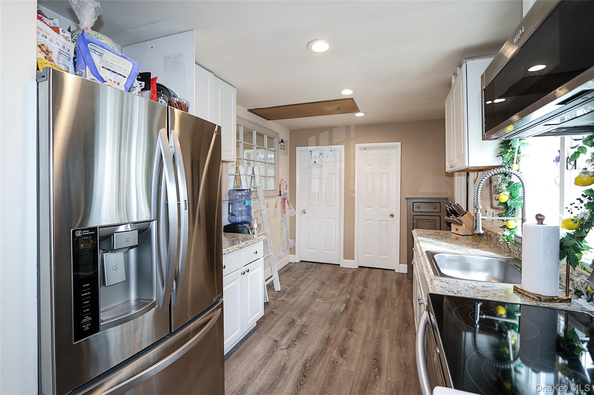 - Kitchen with white cabinets, stainless steel appliances, dark wood-style floors, recessed lighting, and light stone counters