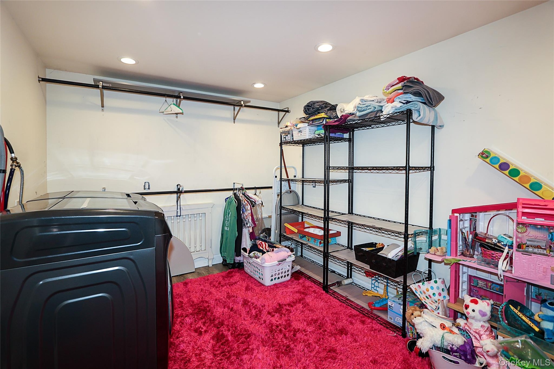 - Laundry area featuring recessed lighting, dark wood-type flooring, and washer and dryer
