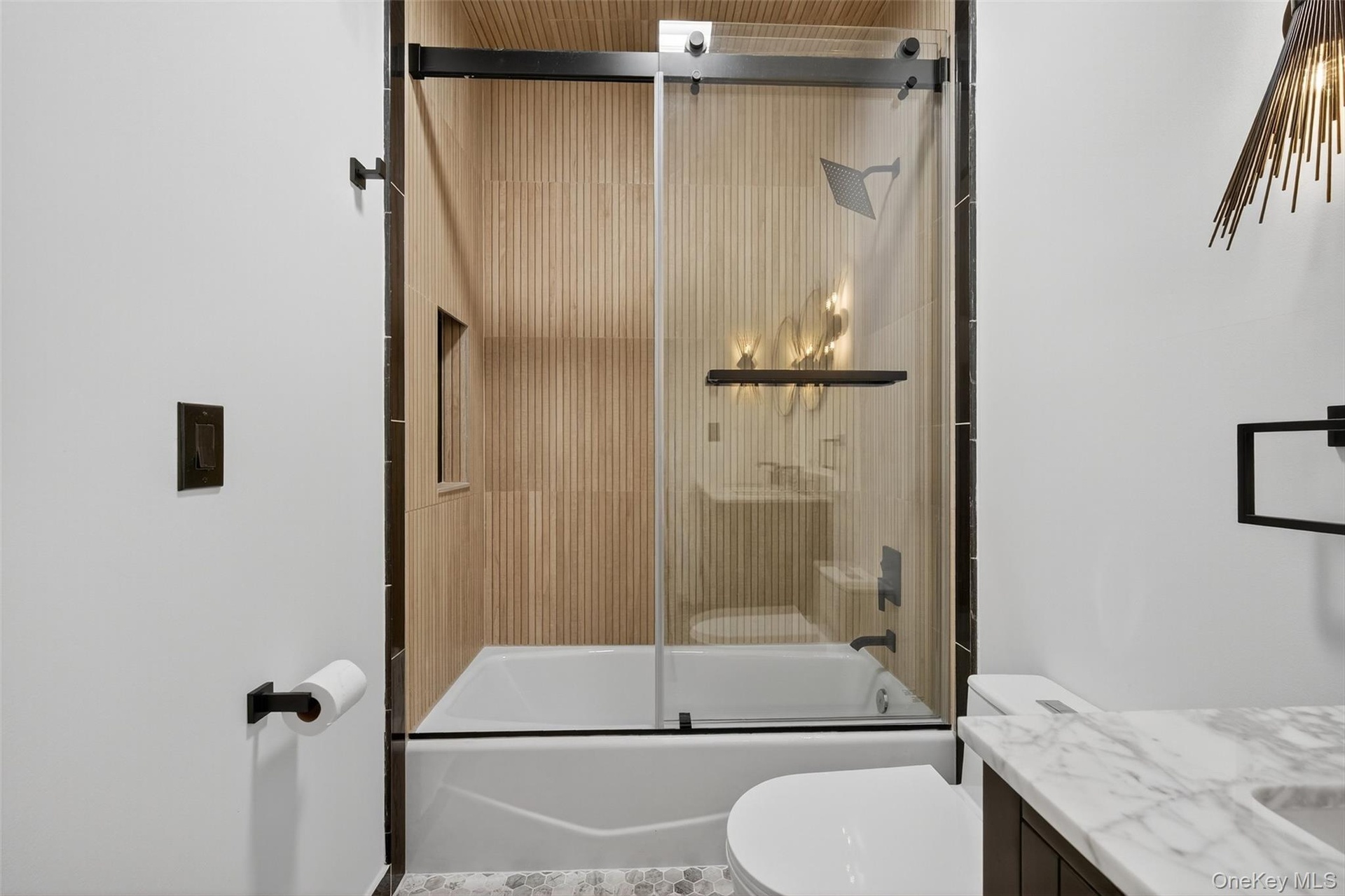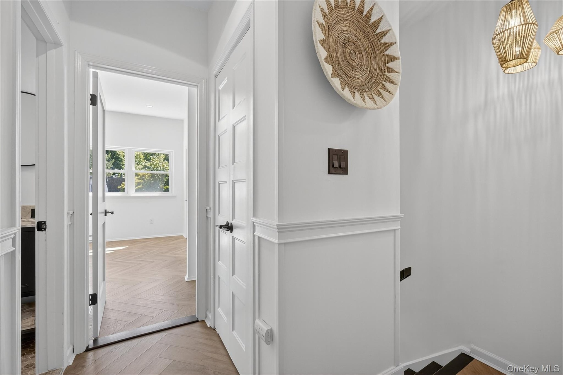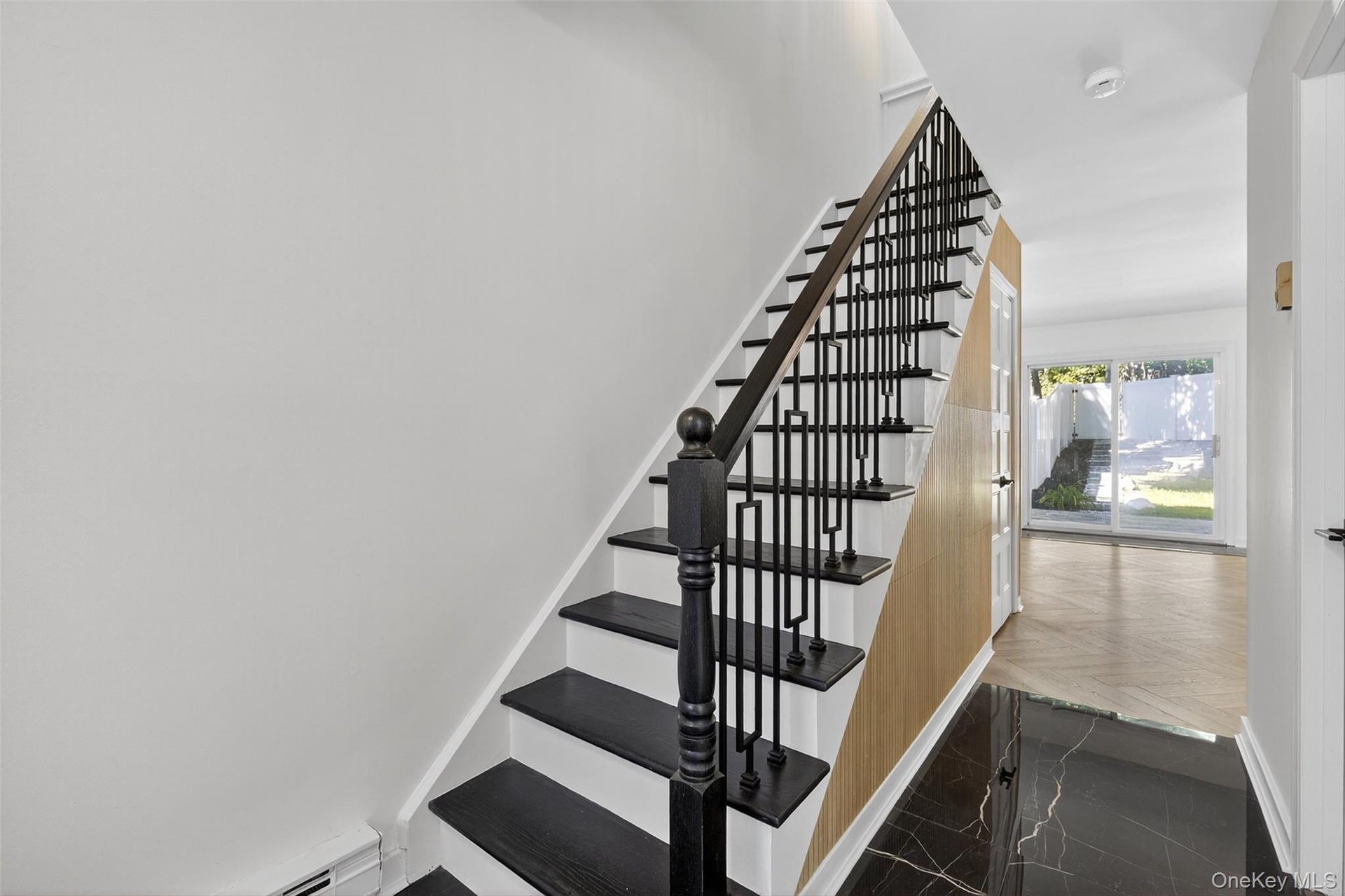 Upstairs, unwind in luxuriously refurbished spaces—a spa-like bathroom with marble-stone flooring, rain-shower/tub combo, matte-black fixtures, custom vanity, and well-placed lighting. Bedrooms are renewed with updated flooring, doors, and two newly installed windows. Thoughtful architectural touches—including staircase tile accents and hallway molding—add upscale comfort throughout.