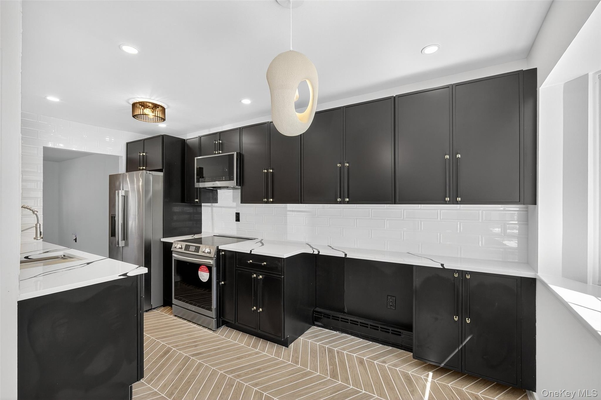 - Kitchen with appliances with stainless steel finishes, light stone countertops, hanging light fixtures, recessed lighting, and backsplash