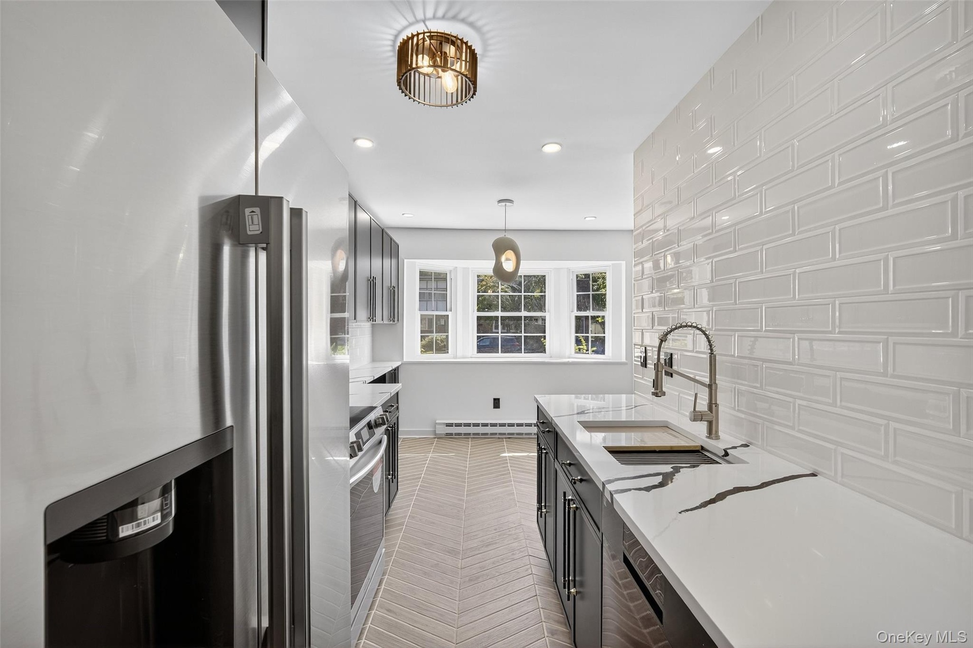 - Kitchen with dark cabinetry, baseboard heating, tasteful backsplash, and a baseboard radiator