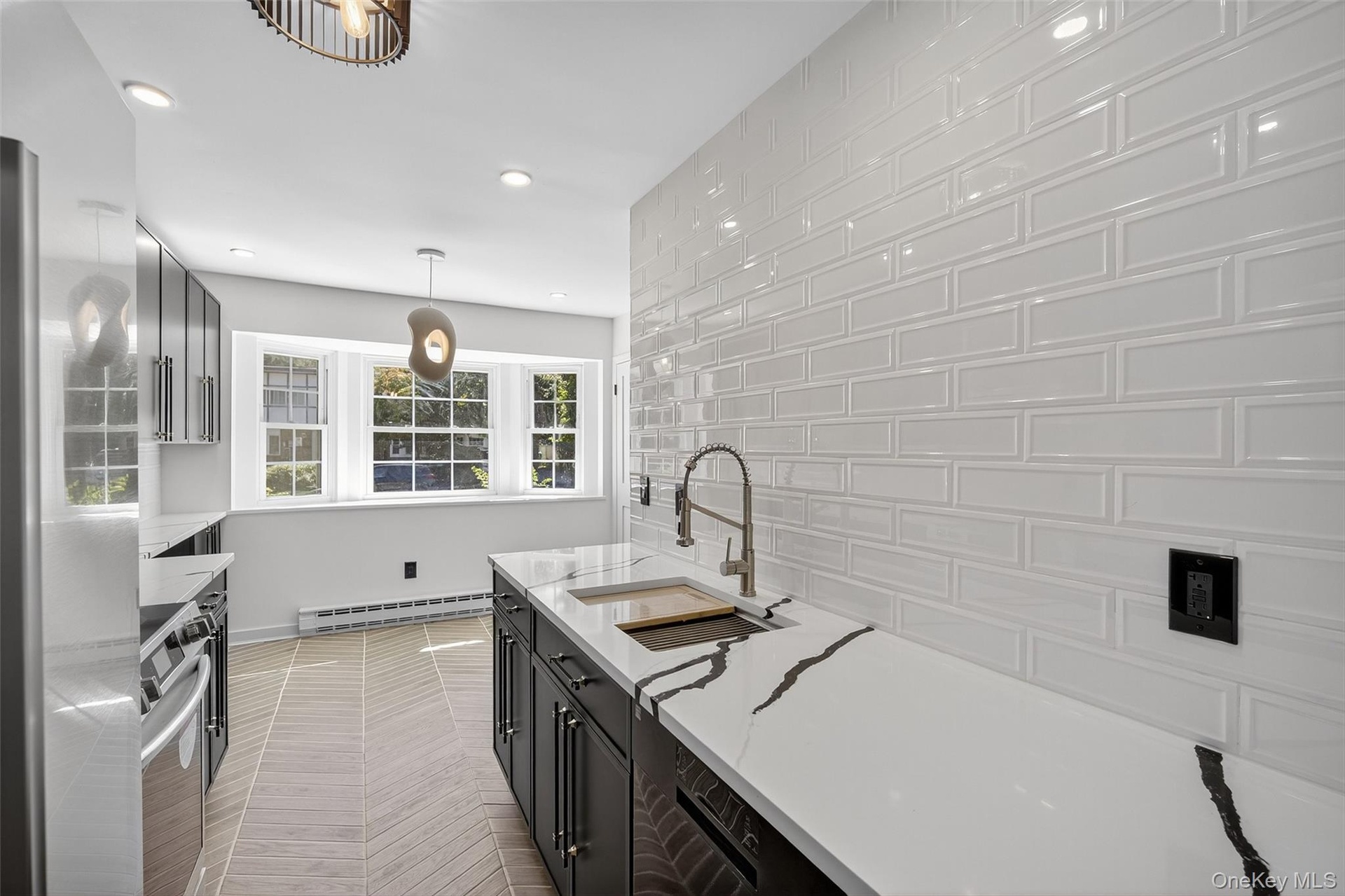 - Kitchen featuring dark cabinetry, pendant lighting, a baseboard radiator, light stone countertops, and decorative backsplash