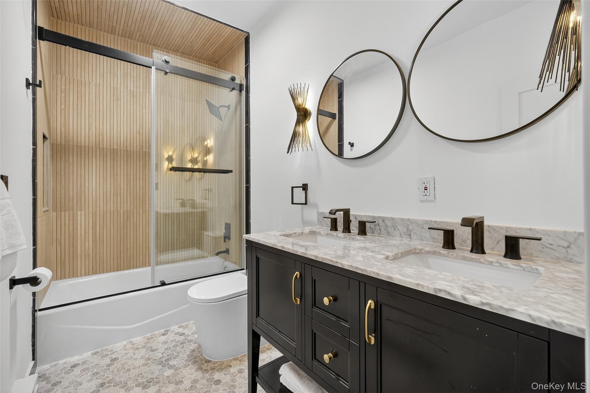 - Full bath with bath / shower combo with glass door, double vanity, and light tile patterned floors