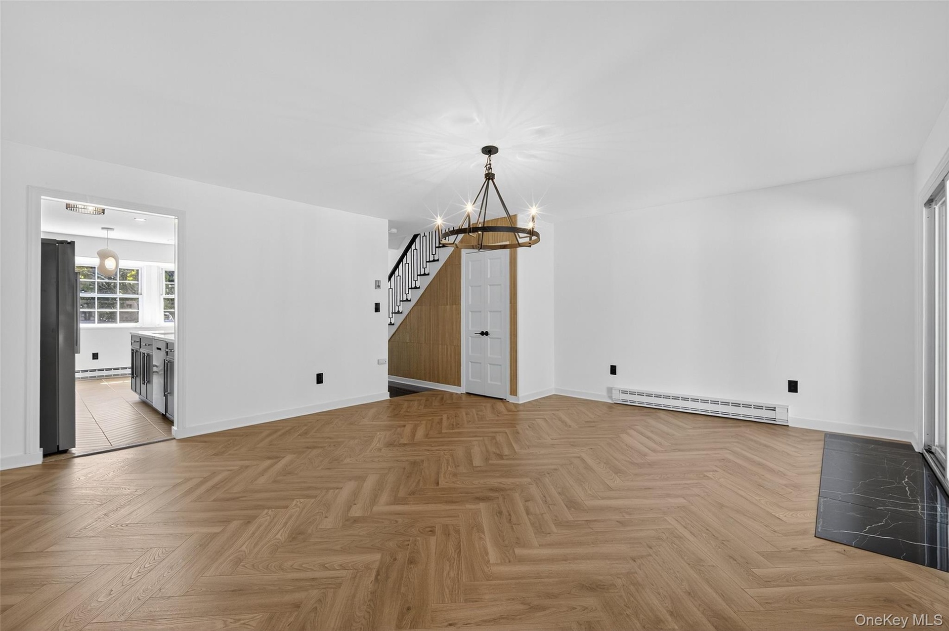 - Unfurnished living room with a baseboard radiator, stairway, and a chandelier