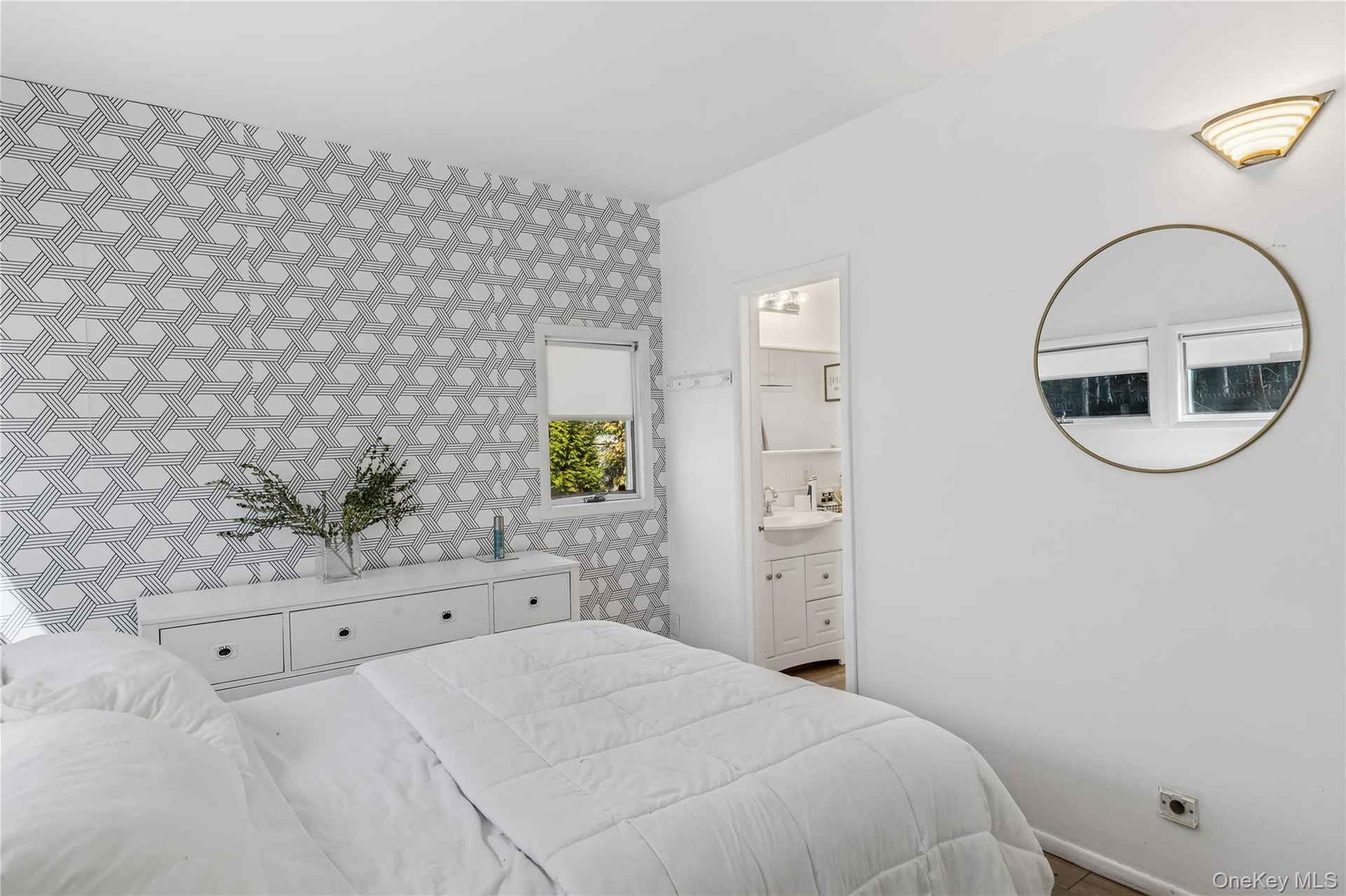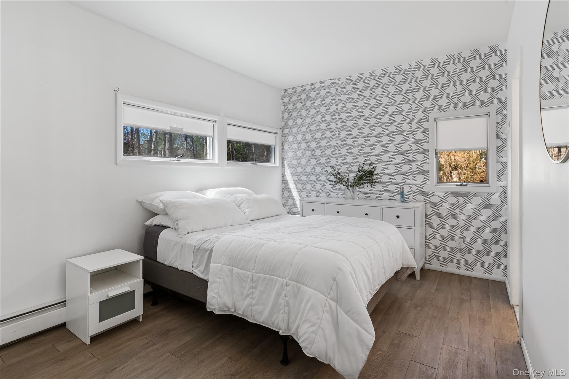 - Bedroom featuring wallpapered walls, wood finished floors, and an accent wall