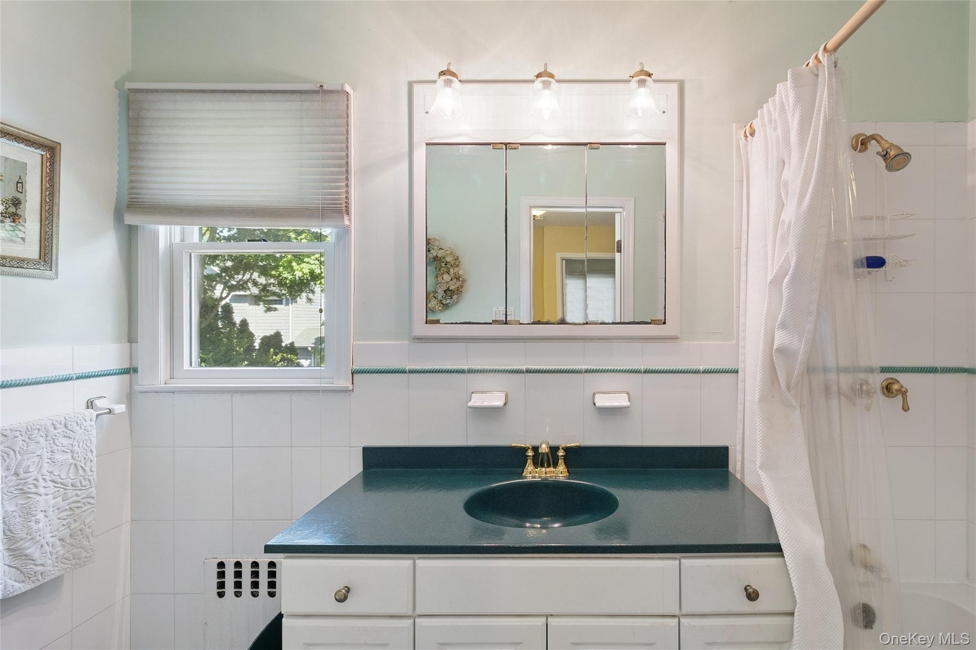 - Full bathroom featuring tile walls, vanity, shower / bath combo with shower curtain, radiator heating unit, and wainscoting