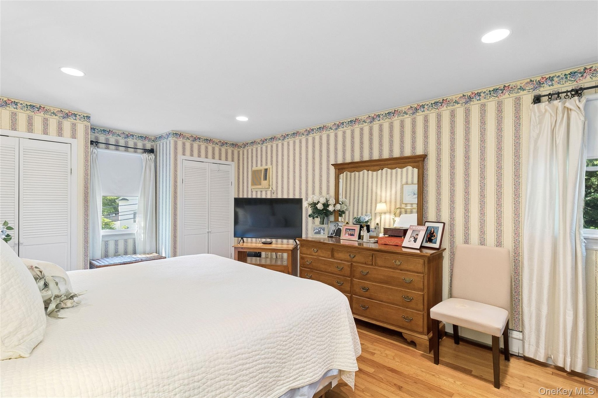 - Bedroom featuring multiple closets, light wood-type flooring, wallpapered walls, and recessed lighting