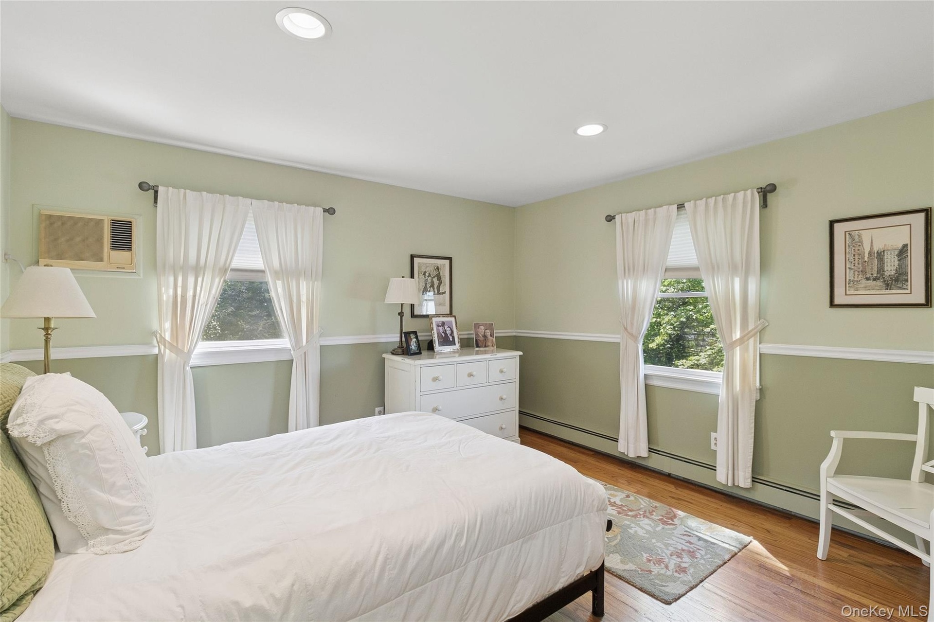 - Bedroom with recessed lighting, light wood-style floors, baseboard heating, and a wall mounted AC