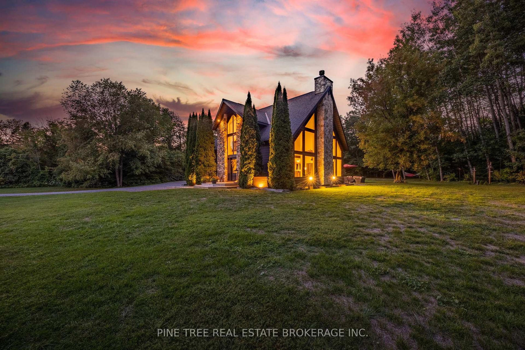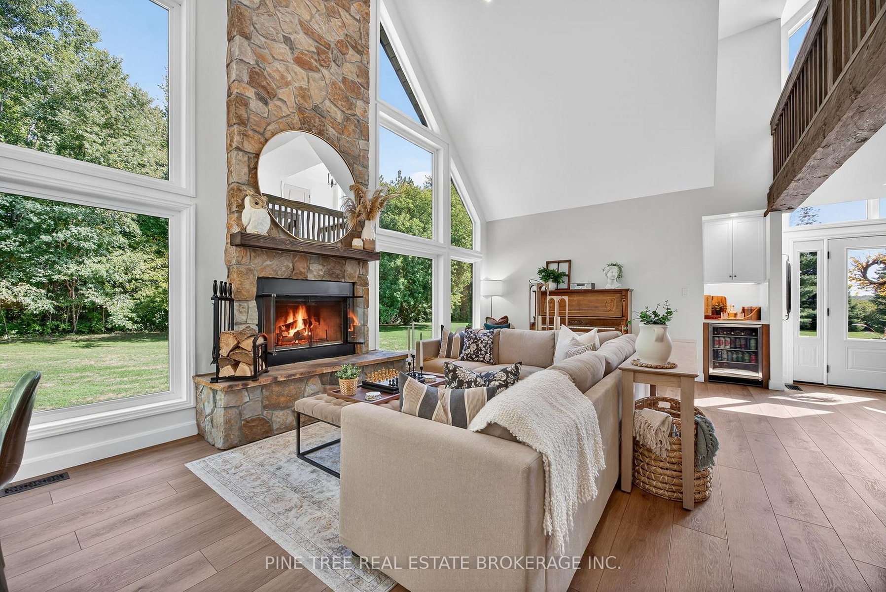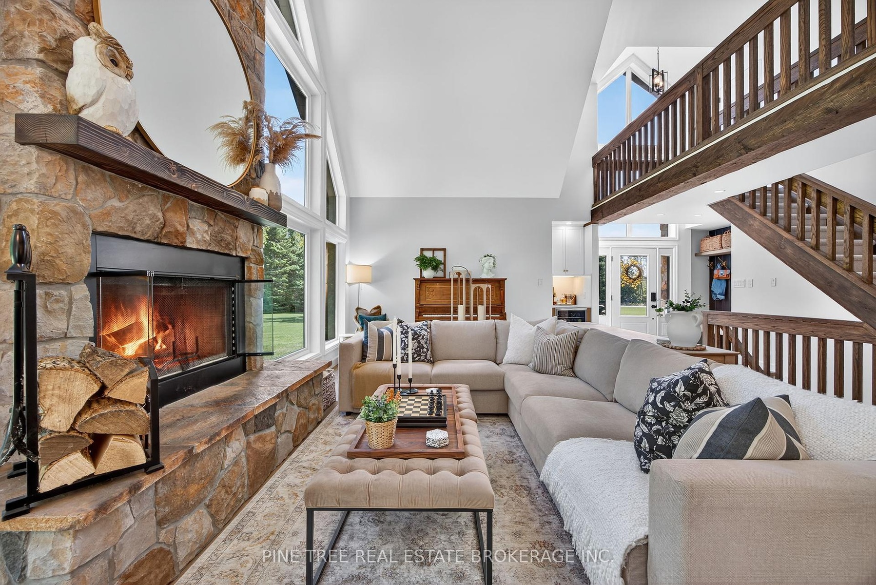 Welcome to this stunning executive Viceroy home, fully renovated-blending timeless craftsmanship with modern luxury. Set on nearly 2 acres of manicured estate grounds surrounded by forest and apple trees, this property offers privacy, elegance, & space to live, work, & play. Inside the open-concept layout is filled with natural light, showcasing hand-hewn post-and-beam accents, custom finishes, & thoughtful upgrades. The main floor features a chefs kitchen with solid wood cabinetry, quartz counters, striking backsplash, & professional-grade appliances. A wood-burning fireplace anchors the breathtaking living room, while the formal dining area, custom bar, oak bench & shelving in the foyer, & walkout to the backyard balance rustic charm with modern design. A remodeled bathroom & 2 bedrooms complete this level. Upstairs, a breezeway overlooking the main floor leads to the luxurious primary suite, a private retreat with a spa-inspired 4-piece ensuite, upgraded closets, new flooring, & refined finishes. The lower level offers versatility with a walk-up separate entrance ideal for multigenerational living. It includes a custom laundry room with quartz counters, remodeled bathroom w/ bathtub, spacious family room, games room with pool table, & a large 4th bedroom. Additional living space is found in the fully insulated and heated 600 sq. ft. loft above the detached two-car garage, perfect as a 5th bed, office, or studio, plus a storage level. Every major system has been upgraded, including central air, a 24KW Generac generator w/ automatic transfer switch, large owned hot water tank, new water treatment system, & 3,785L propane tank. The exterior shines with fresh paint on the home and garage, resurfaced recycled asphalt driveway & new eavestroughs. Location is everything, just 7 minutes to Wasaga Beach, 15 to Barrie & close to all amenities, this estate offers the ultimate commuters dream paired with a resort-style lifestyle - where modern luxury meets rustic elegance.