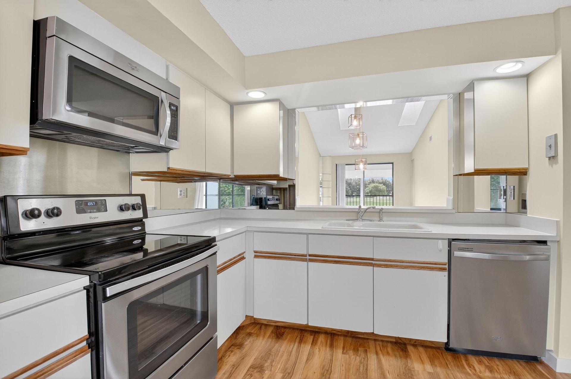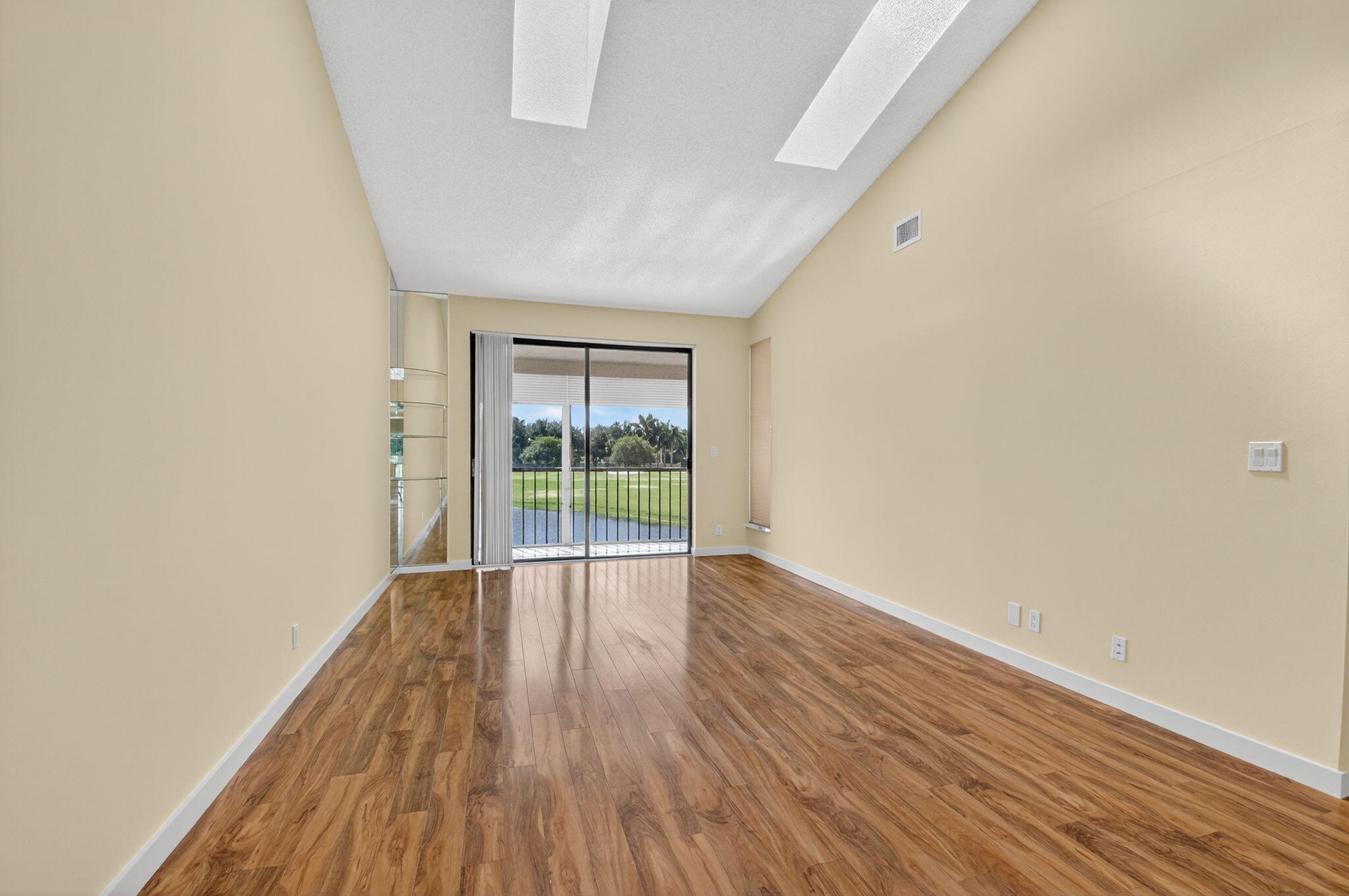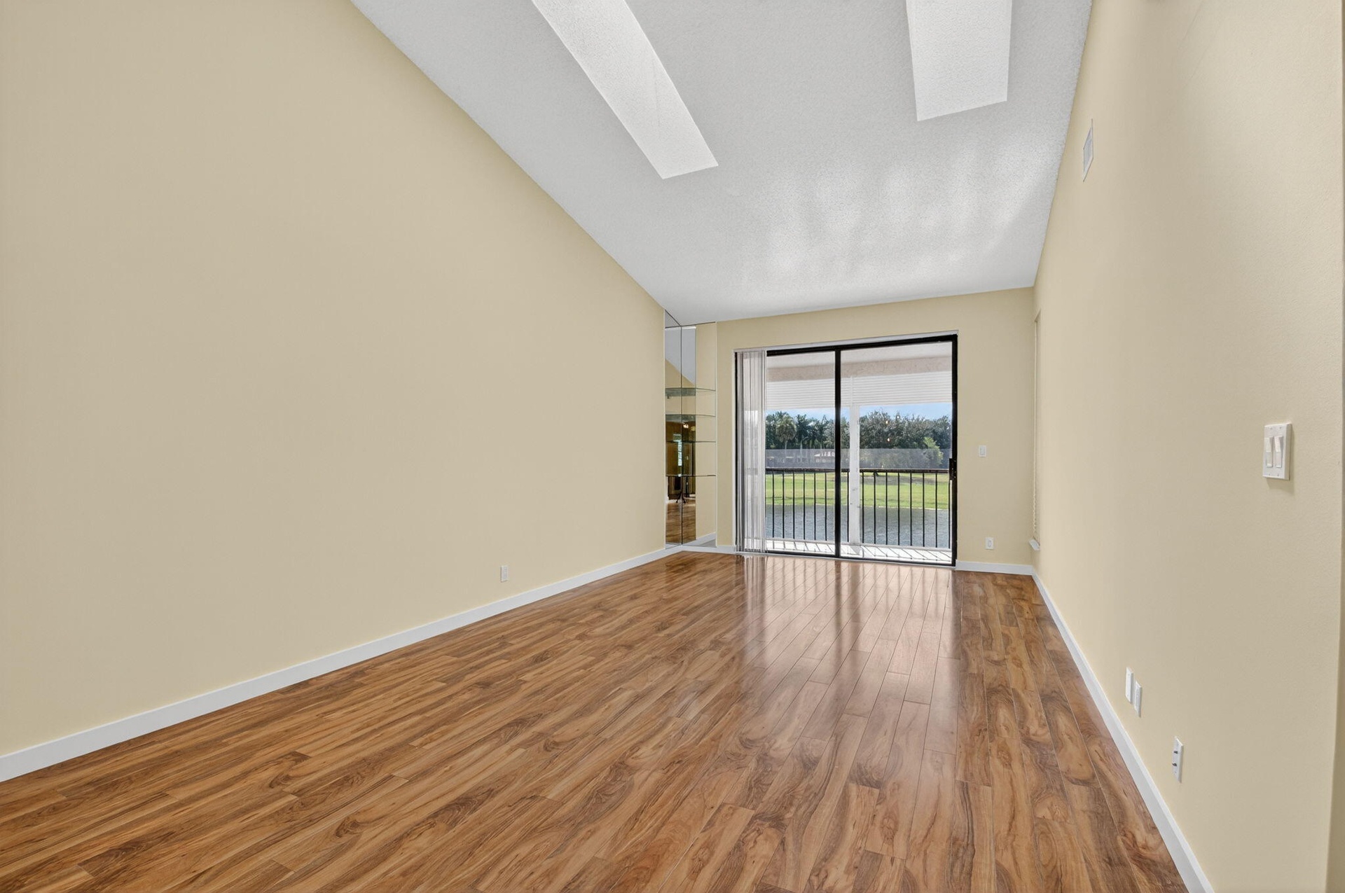 Spacious 3 bedroom, 2 bath condo with 1-car garage in a beautiful La Mirada at Boca Pointe. This 2nd floor home offers vaulted ceilings with skylights that fill the space with natural light, along with easy-care laminate floors throughout. The kitchen features stainless steel appliances and opens to the living area for comfortable entertaining. Enjoy peaceful golf and water southern views from the screened-in patio, complete with pull-down storm shutters and a storage closet. The true third bedroom makes an ideal guest room, office, or den. Move-in ready and located in a desirable community with subdivision pool.