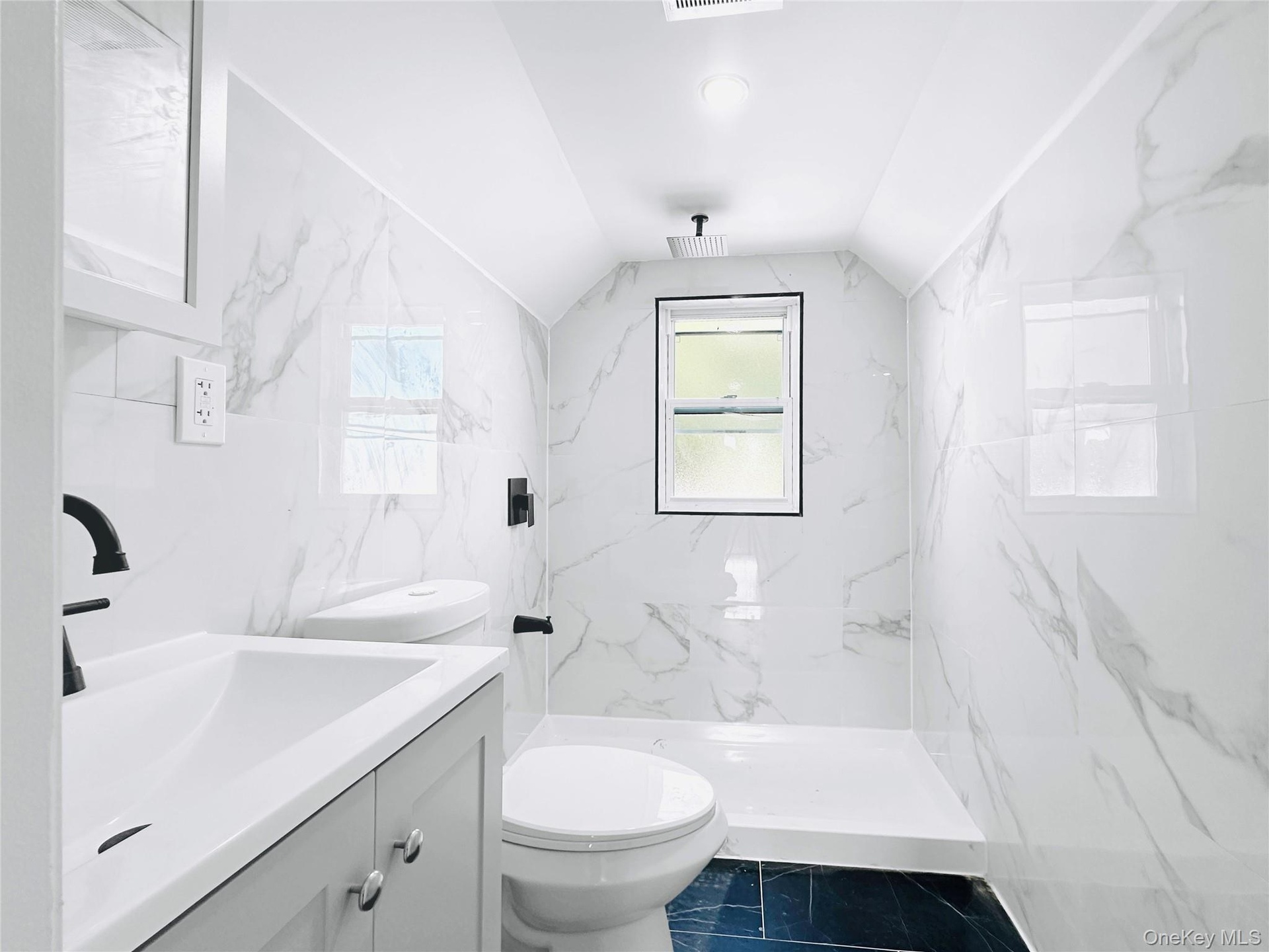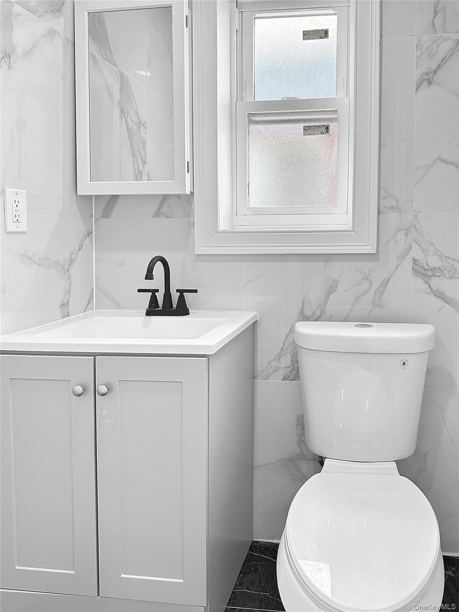 - Bathroom featuring vanity, a marble finish shower, tile walls, and marble finish floors