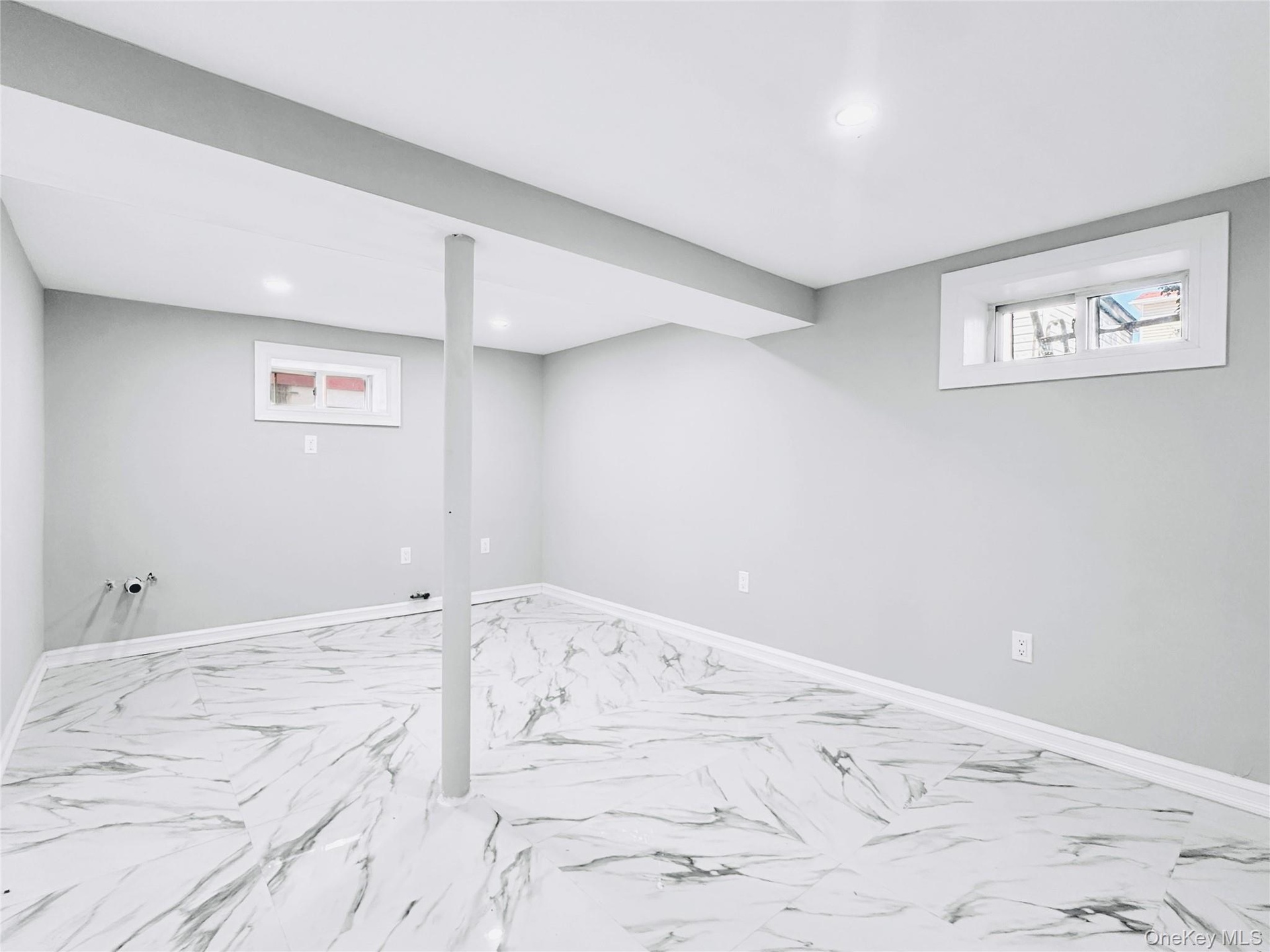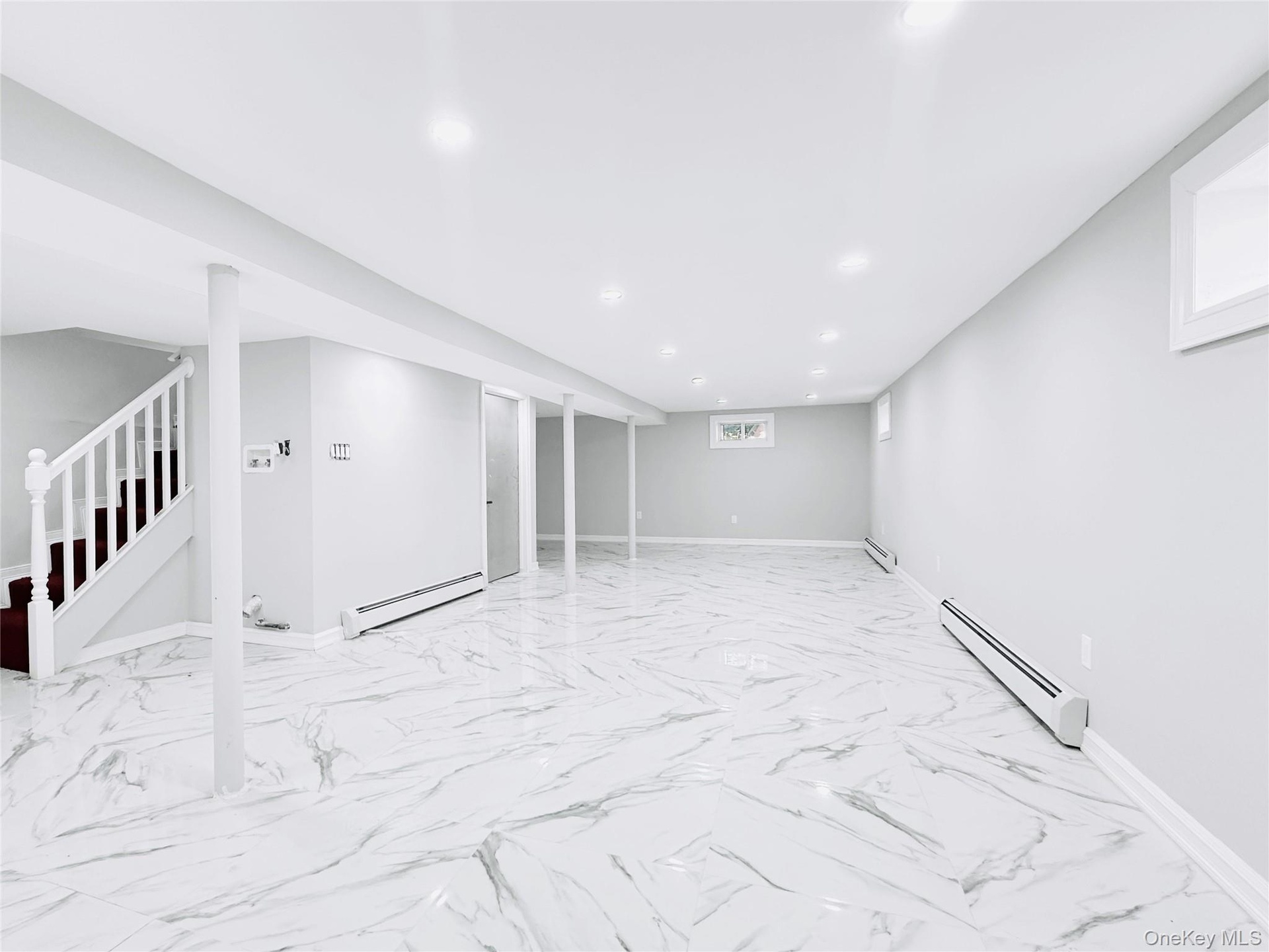 - Basement with baseboard heating, recessed lighting, light marble finish floors, and stairs