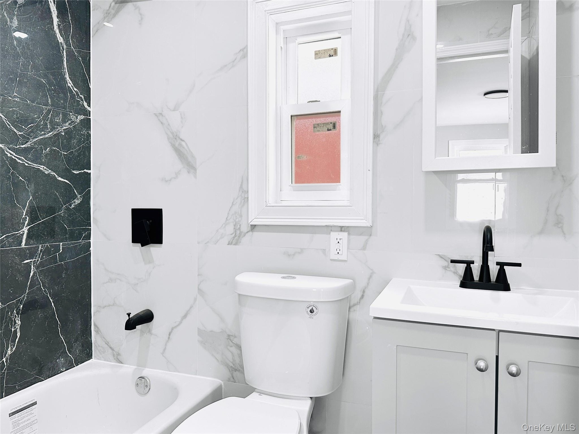 - Bathroom with vanity, stone wall, tile walls, and shower / washtub combination