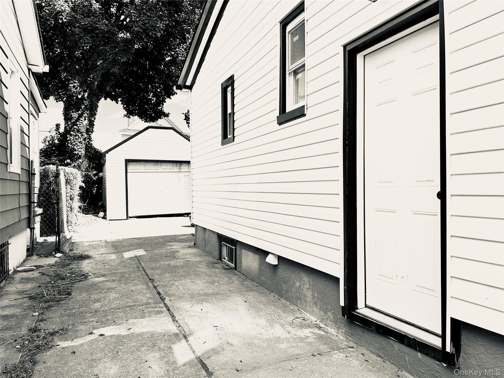 - View of side of home featuring an outdoor structure, a detached garage, and concrete driveway