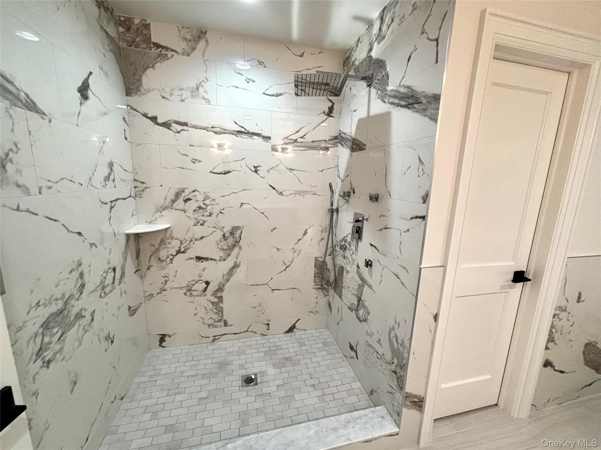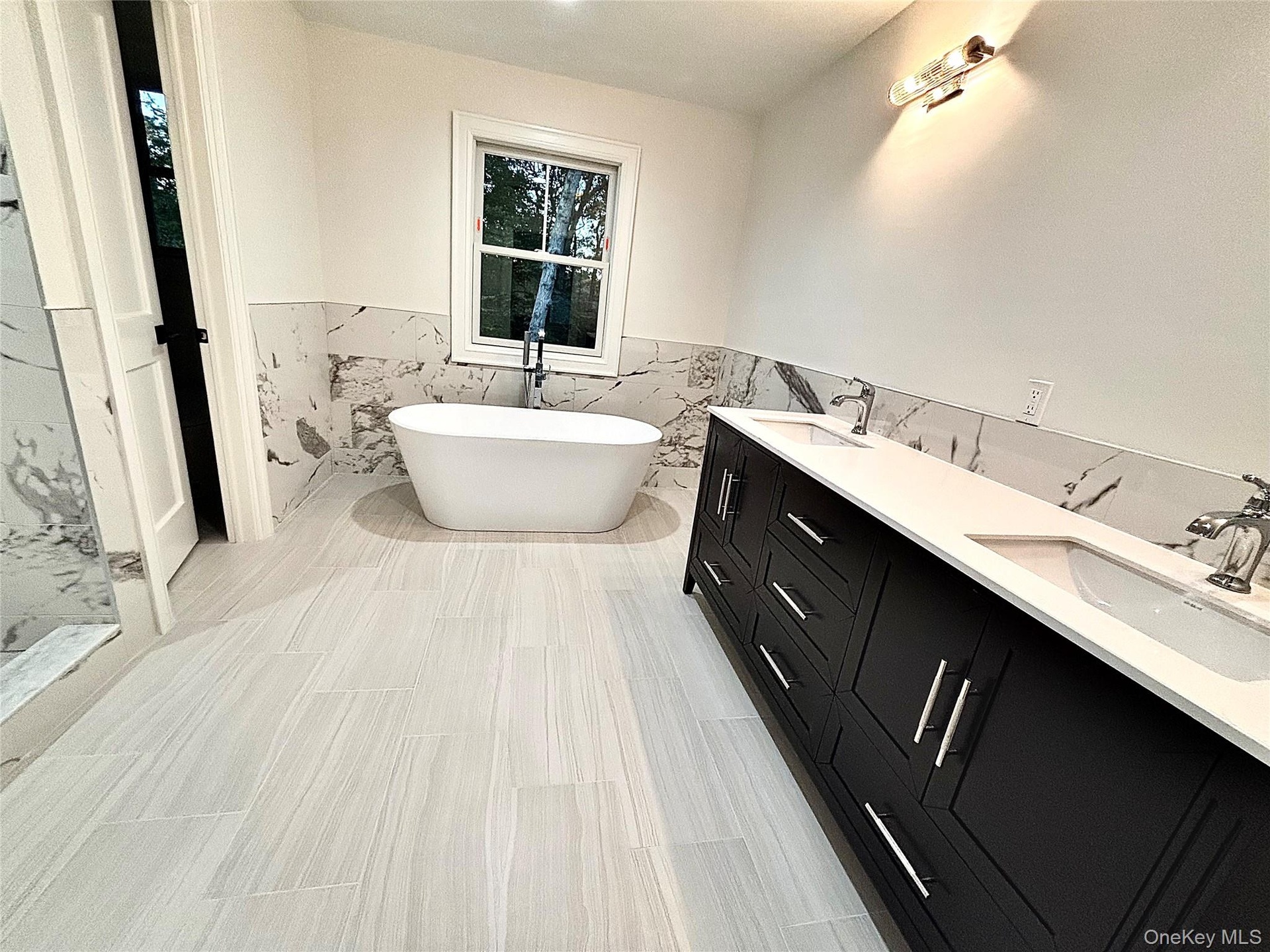 - Full bath featuring tile walls, wainscoting, a soaking tub, double vanity, and a stall shower