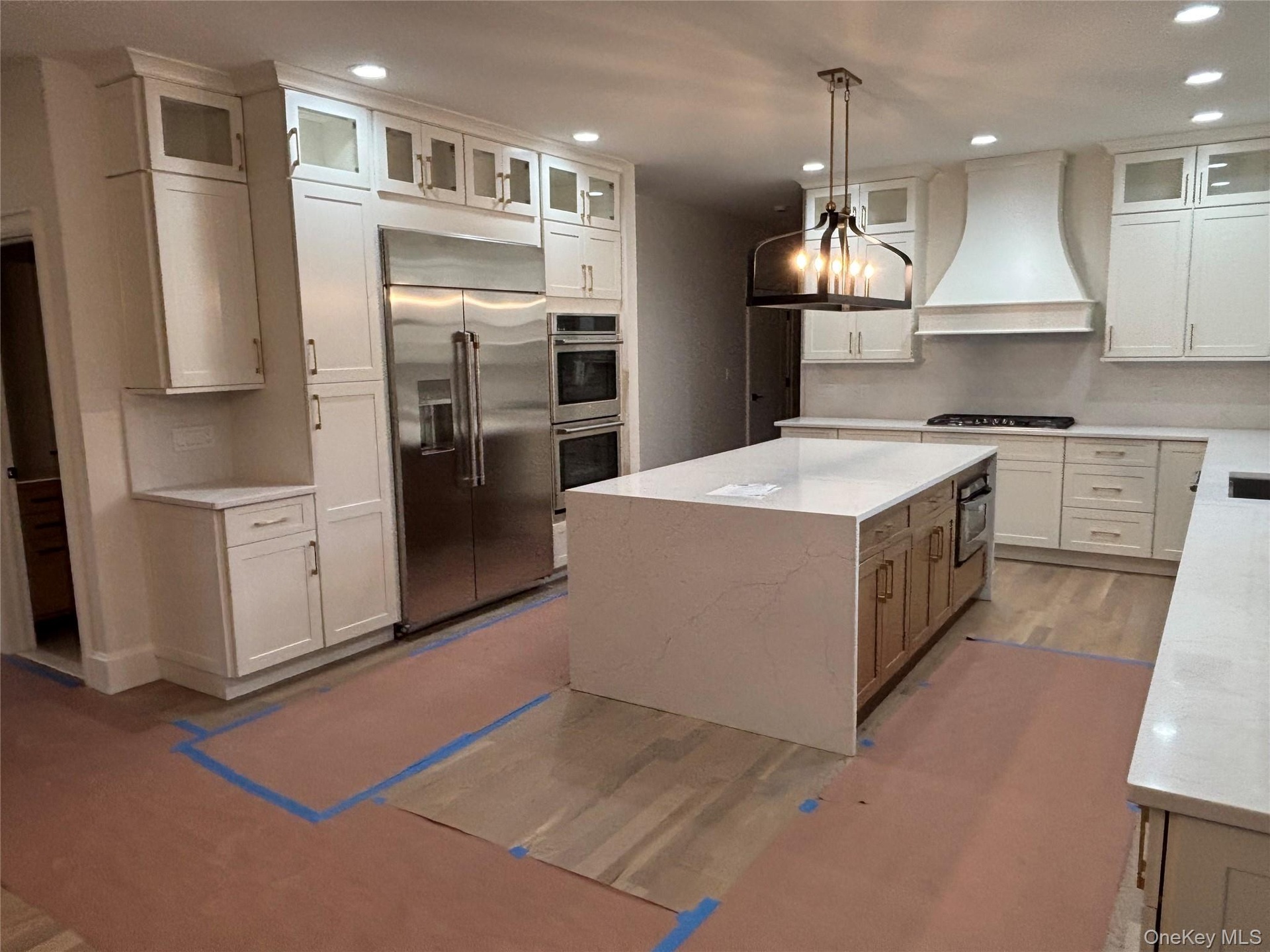 - Kitchen with glass insert cabinets, white cabinets, stainless steel appliances, custom exhaust hood, and recessed lighting
