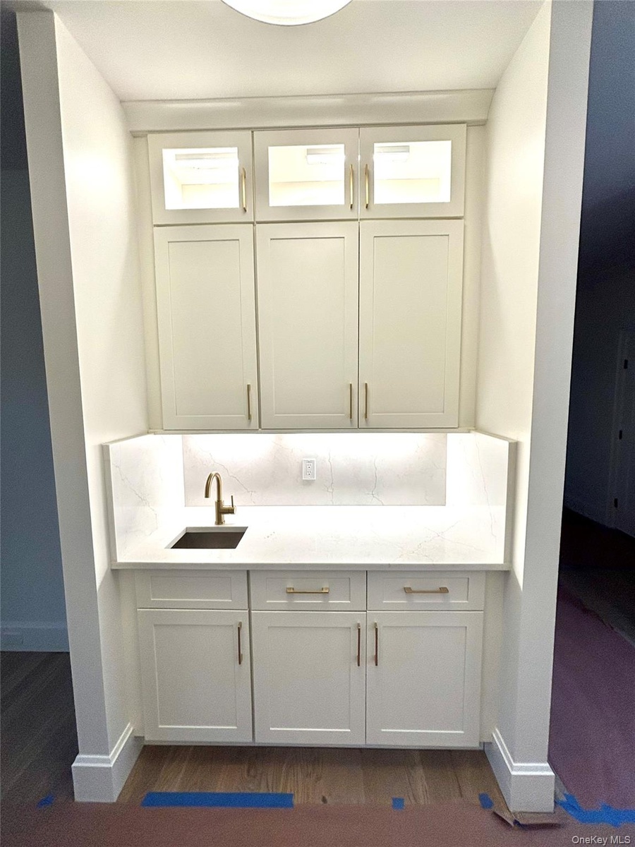 - Bar area with glass insert cabinets, light stone countertops, white cabinets, dark wood-style floors, and tasteful backsplash