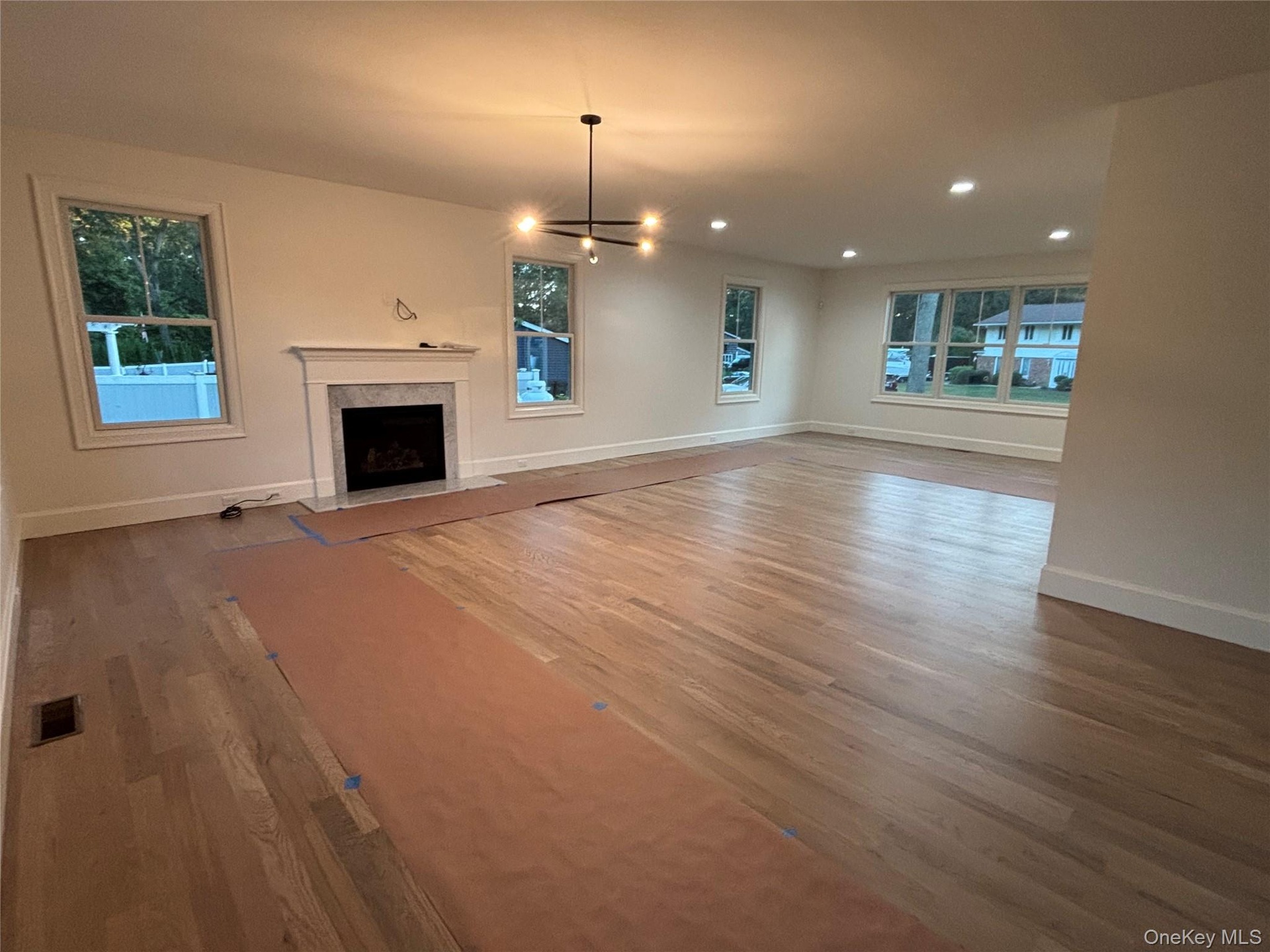 - Unfurnished living room with recessed lighting, a high end fireplace, healthy amount of natural light, wood finished floors, and a chandelier