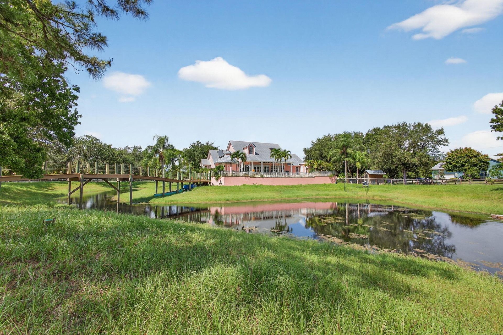 Every house has a story and this beloved farmhouse in Palm City has love and laughter in every chapter. The picturesque setting of 4.39 fully-fenced acres, mature trees, and a wooden bridge over a pond frequented by ducks, is the backdrop for this four bedroom, four bathroom home. Greet your guests from the covered porch. Gather in the living room, retreat into the family room for television or quiet time, or wander into the open and airy country-kitchen for a quick bite or a savory meal. Dine al-fresco on the back porch overlooking the pool, spa and scenic waterfall or head upstairs to the loft, a perfect space for an art studio, fitness room. An over-sized two-car garage with TWO attached guest apartments, each with its own kitchen, completes the package. Chicken coop does not convey.