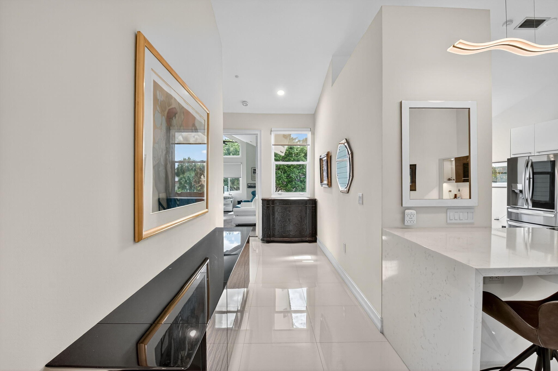 Experience luxury in this renovated 2nd-floor penthouse located in the desirable village of Clubside Pointe in Broken Sound Country Club. Offering 2,539 sqft of sophisticated living space, this 3-bedroom, 3.5-bath residence combines elegant finishes with modern upgrades. A private pneumatic vacuum elevator provides effortless access to the main living area, where you'll find an open floor plan, sleek porcelain tile floors, & soaring vaulted ceilings. The stunning kitchen is designed for both style and function, featuring quartz countertops, white cabinetry, and a custom bar/coffee station with two beverage coolers and extra storage. The spacious primary suite offers sweeping golf course views, a walk-in closet, and a spa-like en-suite bath. Relax and entertain on the enclosed patio that
