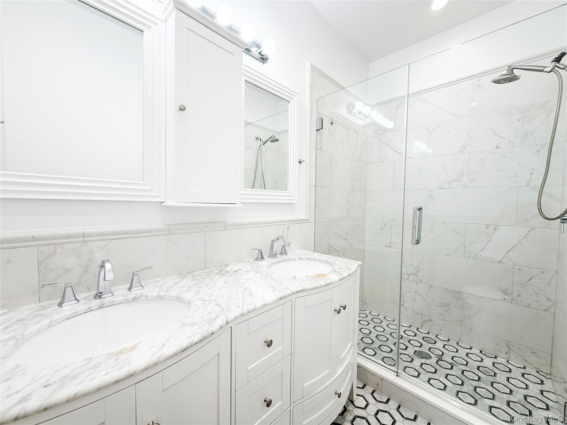 - Full bathroom with a marble finish shower, double vanity, and tile walls