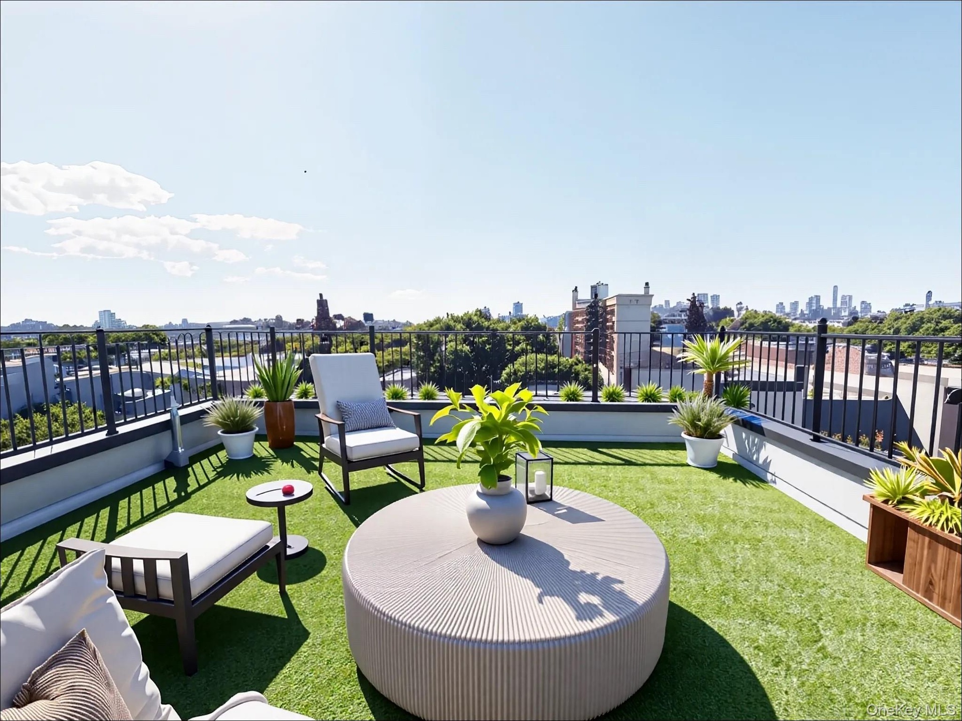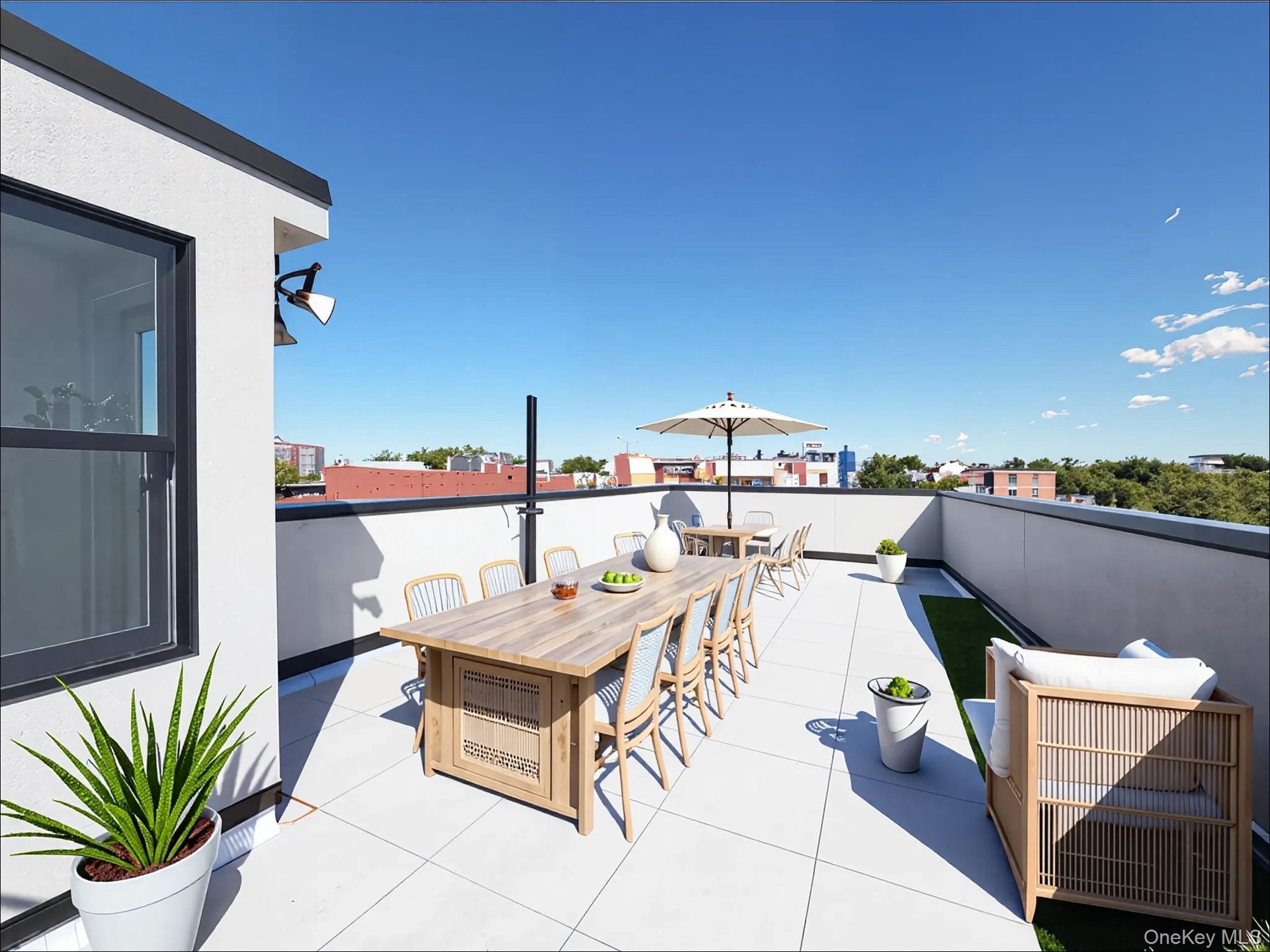 The top level offers a true sanctuary: a penthouse-style primary suite with dual exposures, a large closet, en-suite bath, and radiant floor heating for added comfort. This floor connects directly to one of two private roof decks. The lower roof terrace provides expansive Brooklyn views, while the upper deck soars above the neighborhood, offering dramatic 360-degree vistas of the Manhattan skyline, including landmarks like the Empire State Building, One World Trade, and 432 Park Avenue.