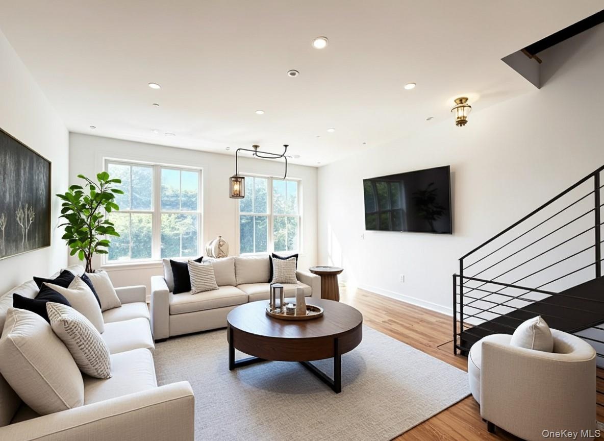 - Living area featuring light wood finished floors, recessed lighting, and stairs