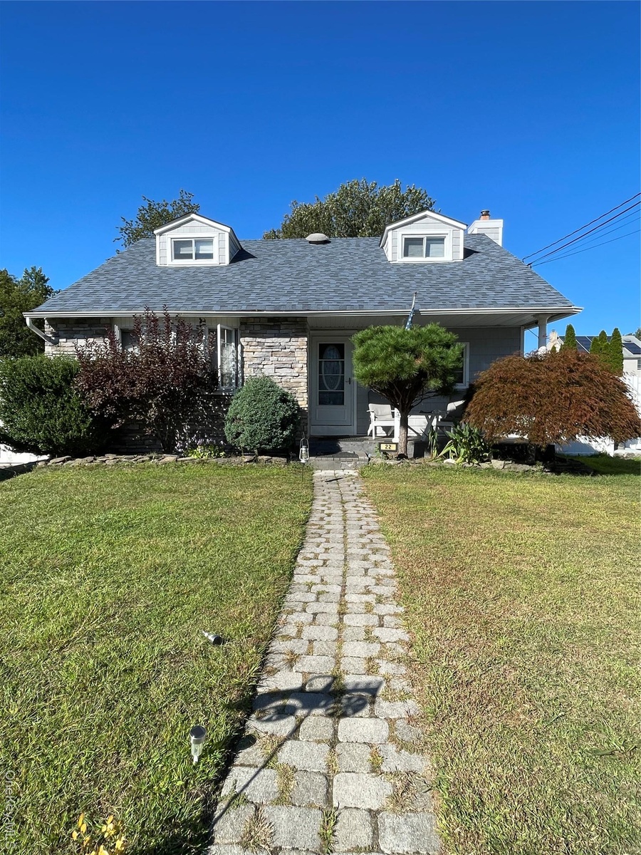 - Expanded Cape-style house featuring a shingled roof, a front lawn, a porch, and a chimney