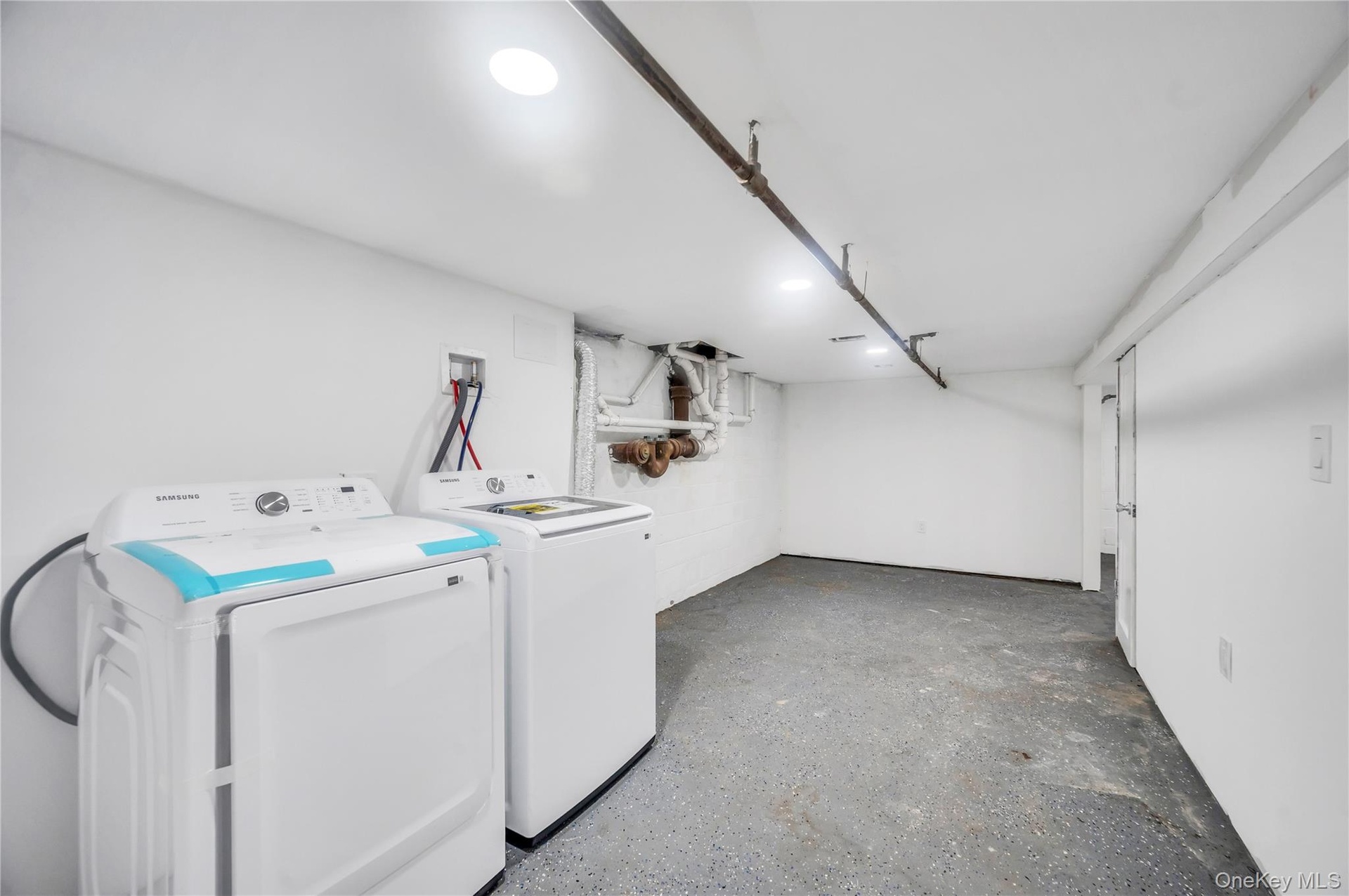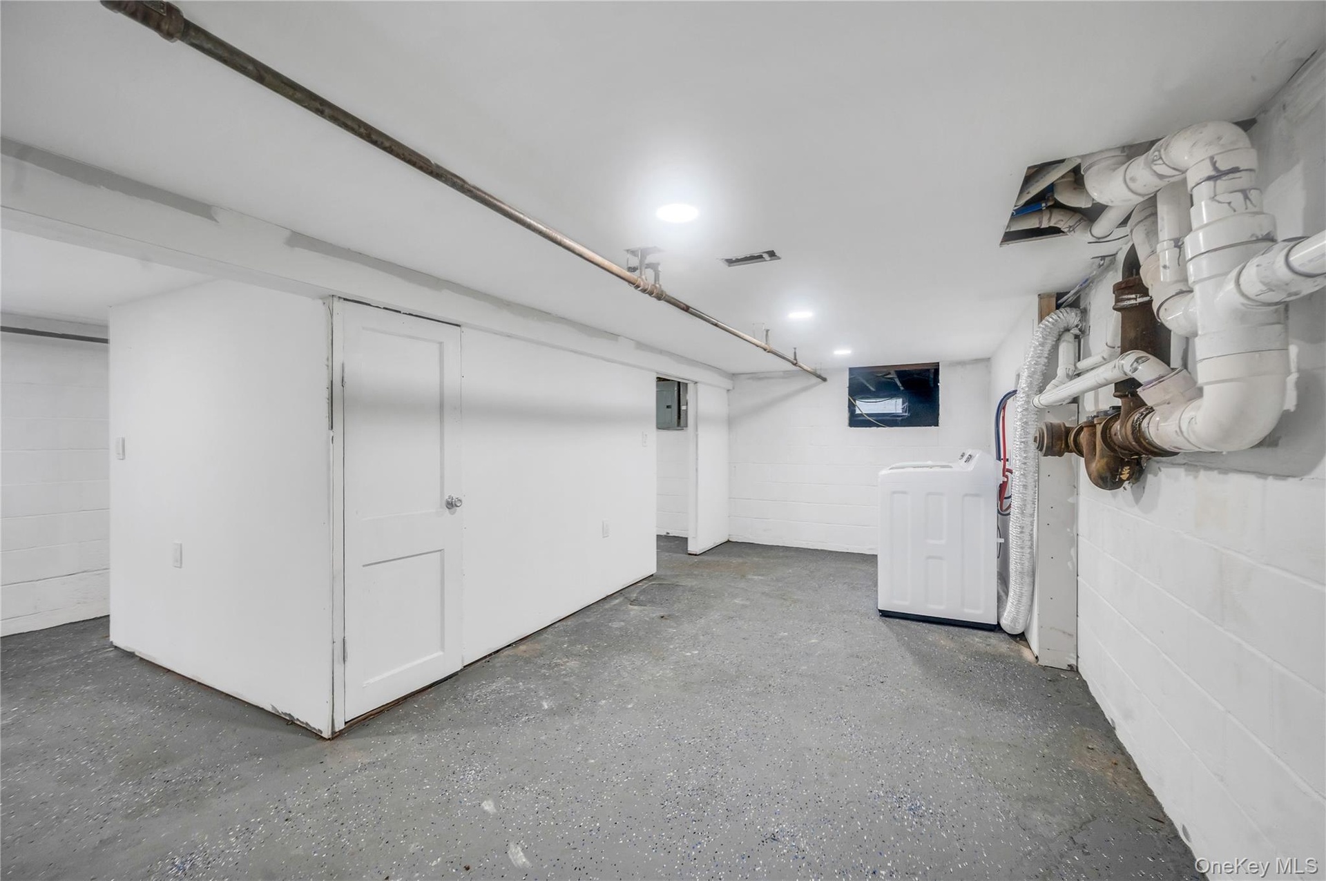 - Finished basement with concrete block wall, a heating unit, and washing machine and clothes dryer