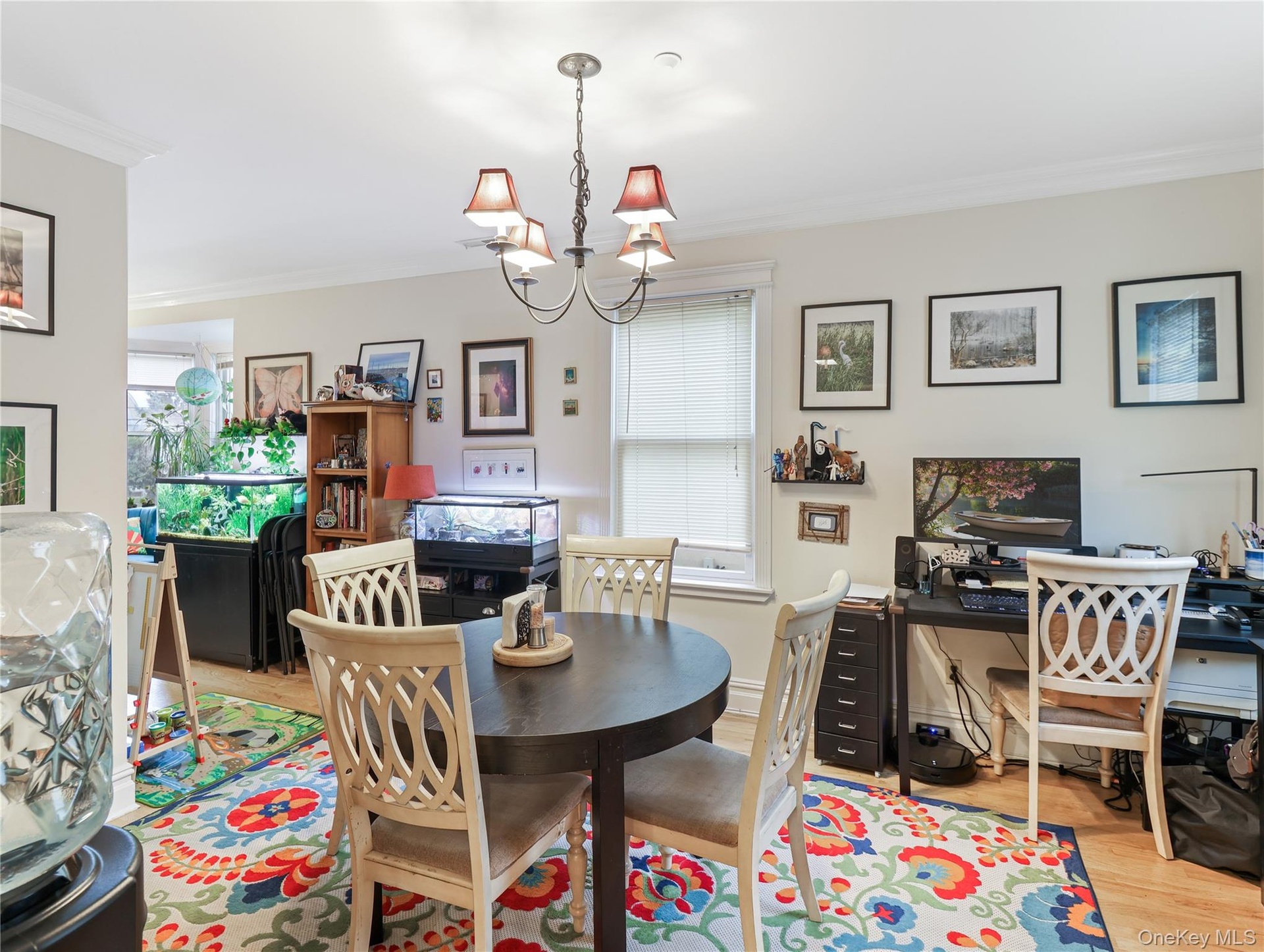 - Dining space featuring light wood finished floors, healthy amount of natural light, ornamental molding, and a chandelier