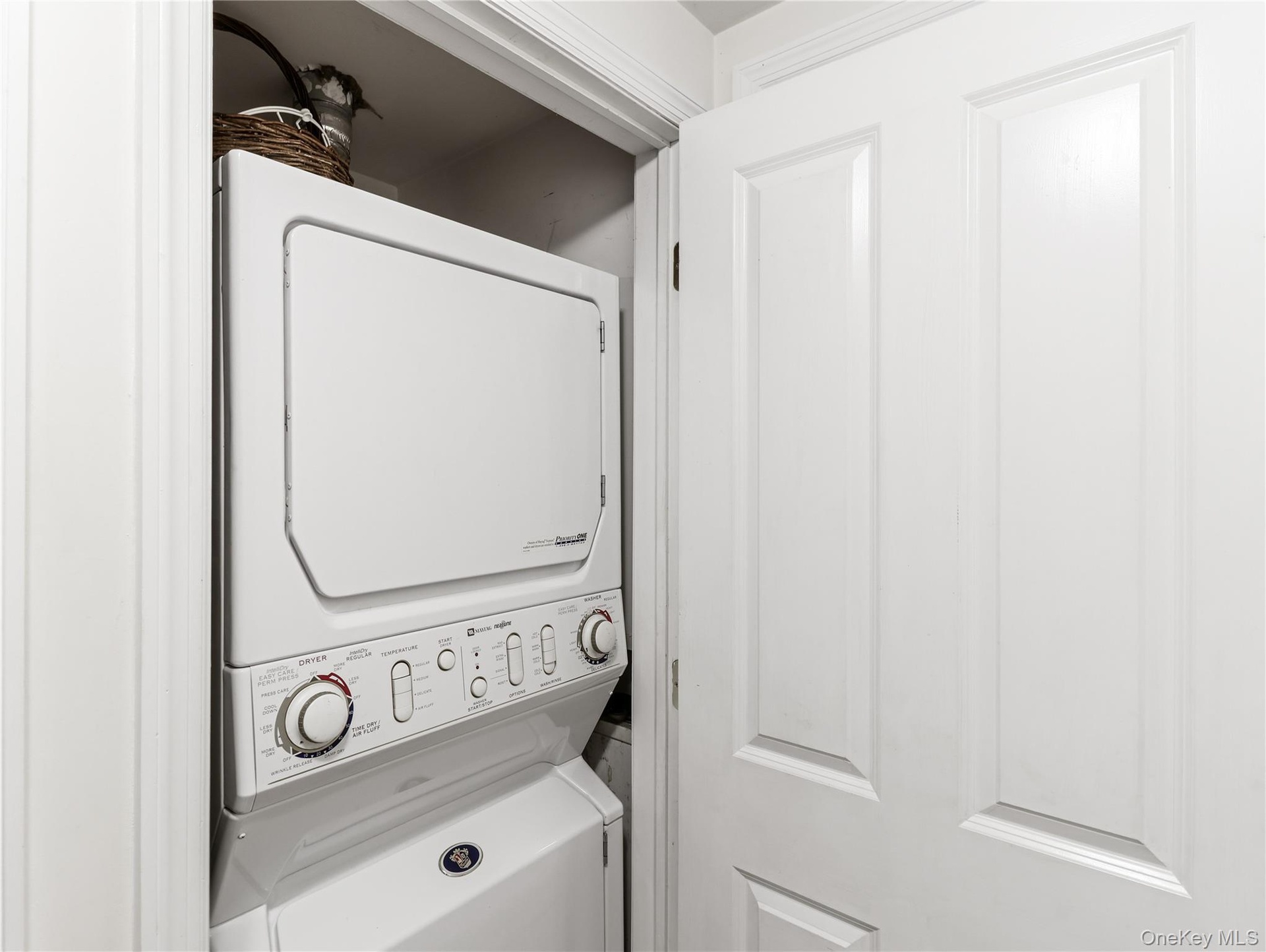 - Washroom with stacked washer and clothes dryer and tile patterned flooring