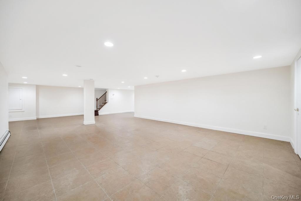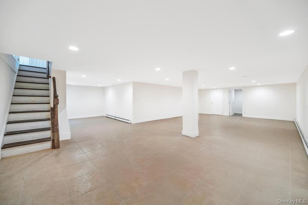 - Finished below grade area with baseboard heating, recessed lighting, and stairway