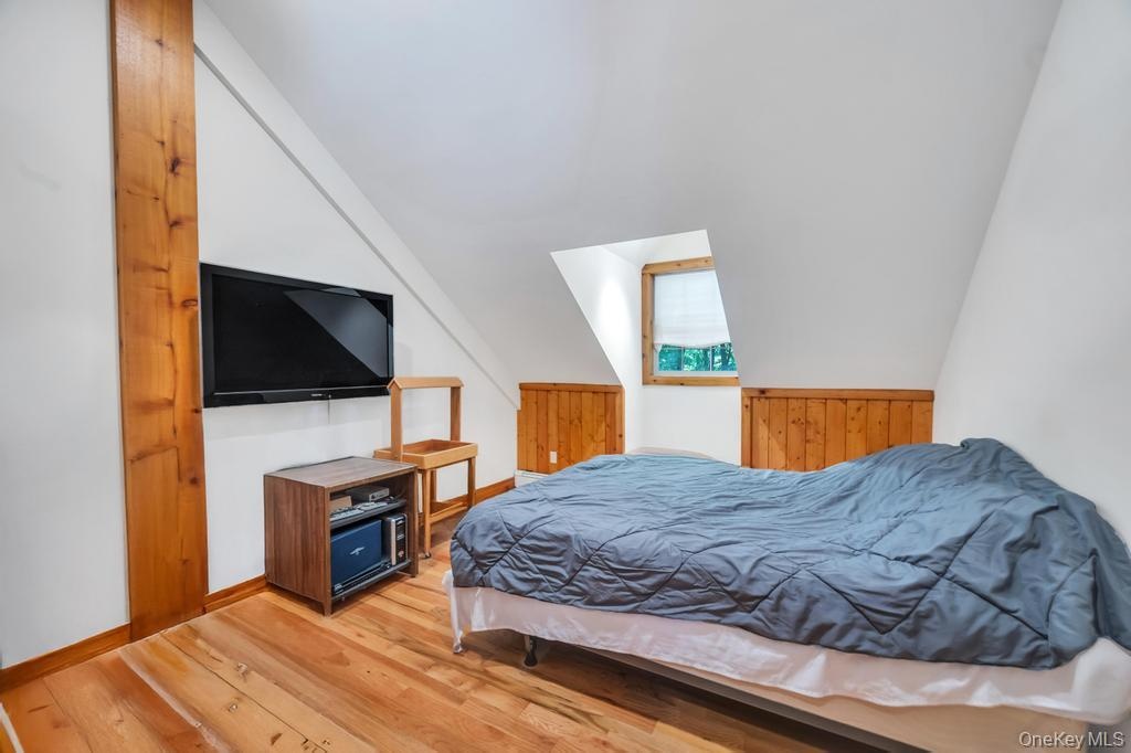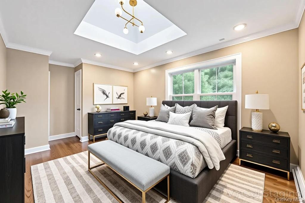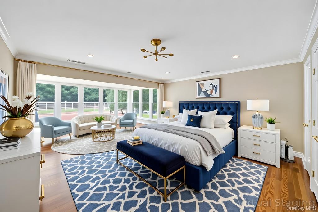 - Bedroom with ornamental molding, wood finished floors, and recessed lighting