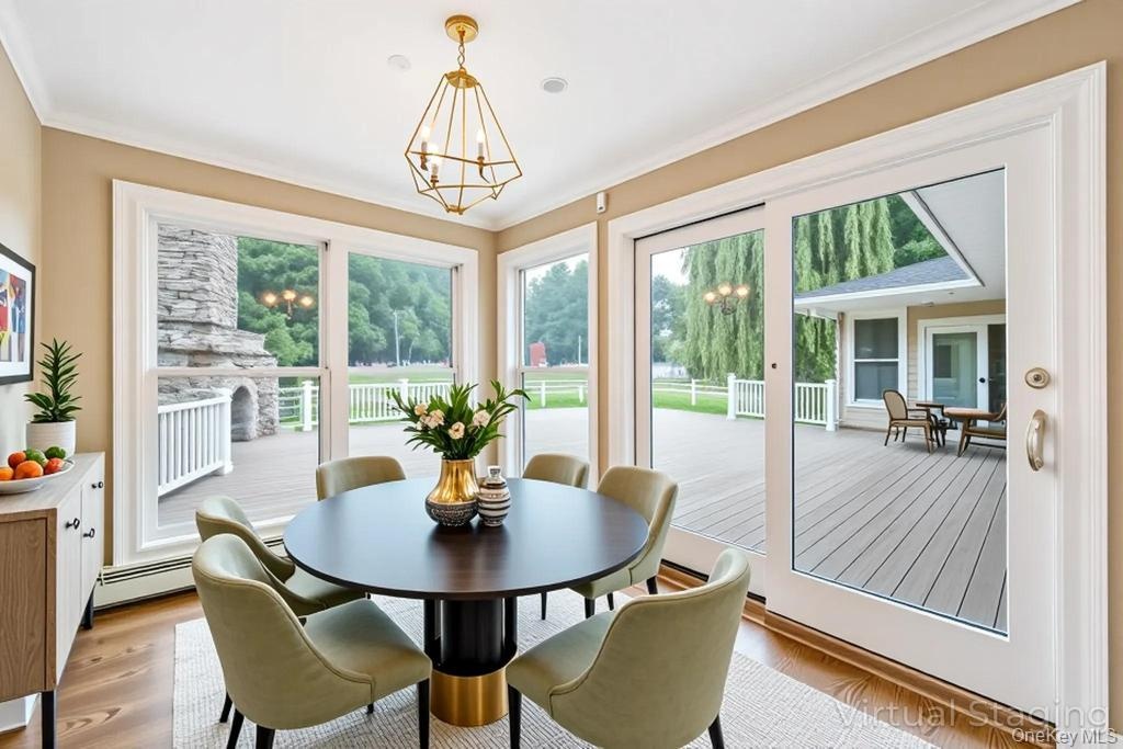 - Dining room featuring a chandelier, wood finished floors, plenty of natural light, crown molding, and a baseboard radiator