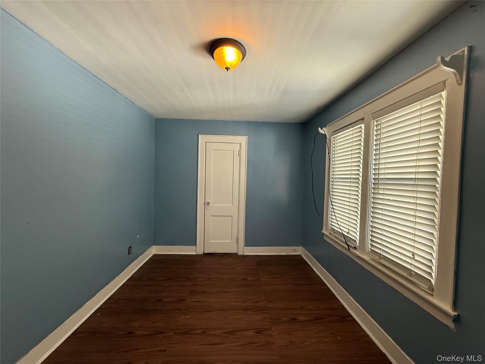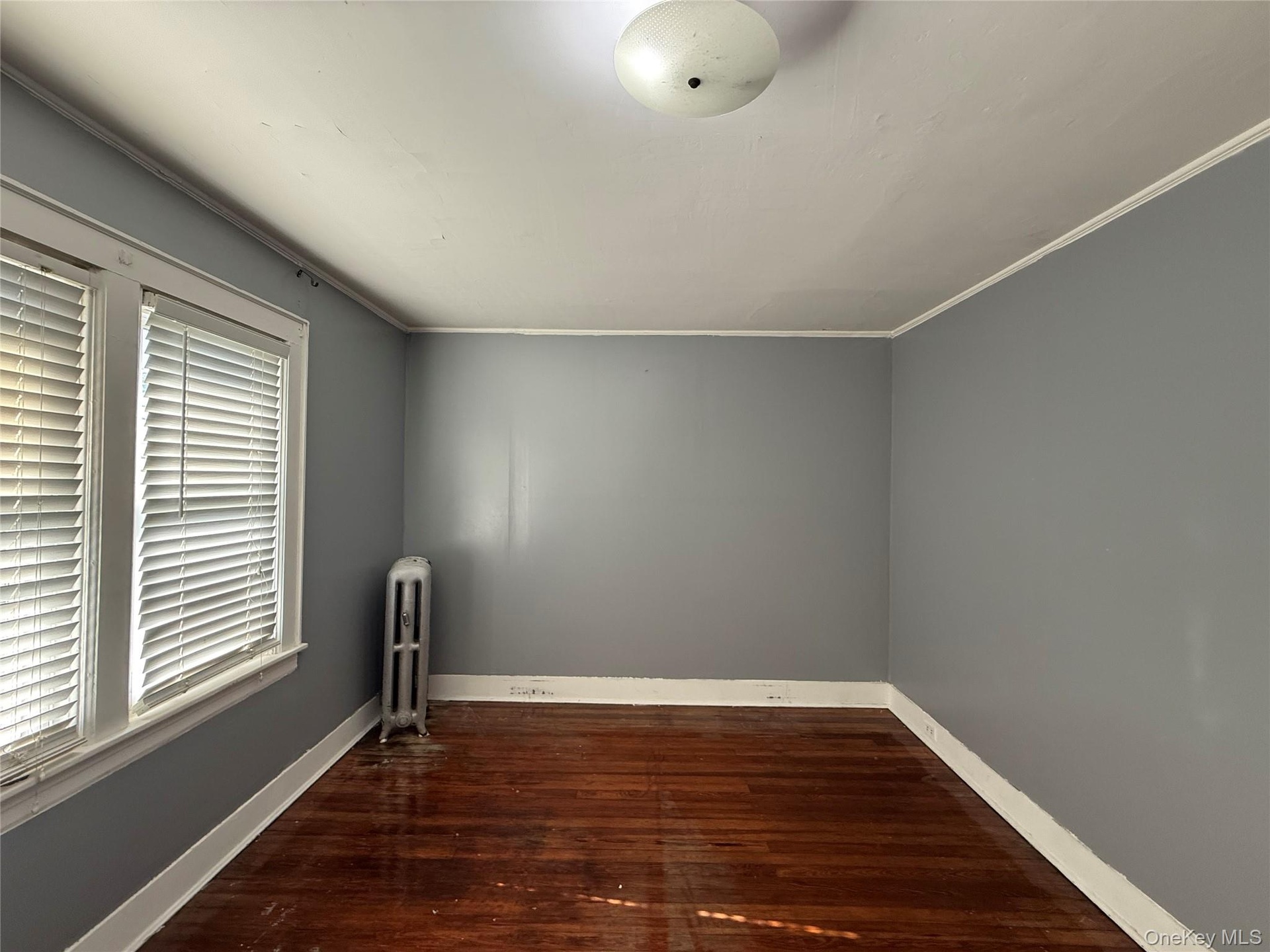 - Unfurnished room with dark wood-type flooring, ornamental molding, and radiator heating unit