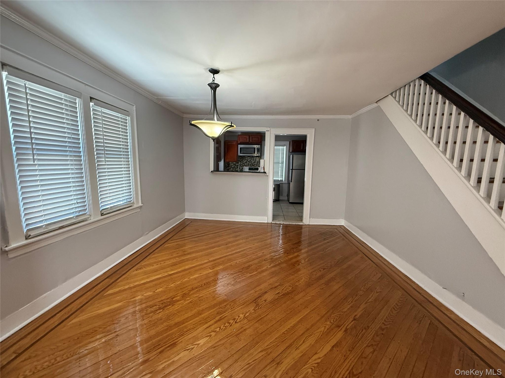 - Unfurnished dining area featuring light wood finished floors, crown molding, and stairway